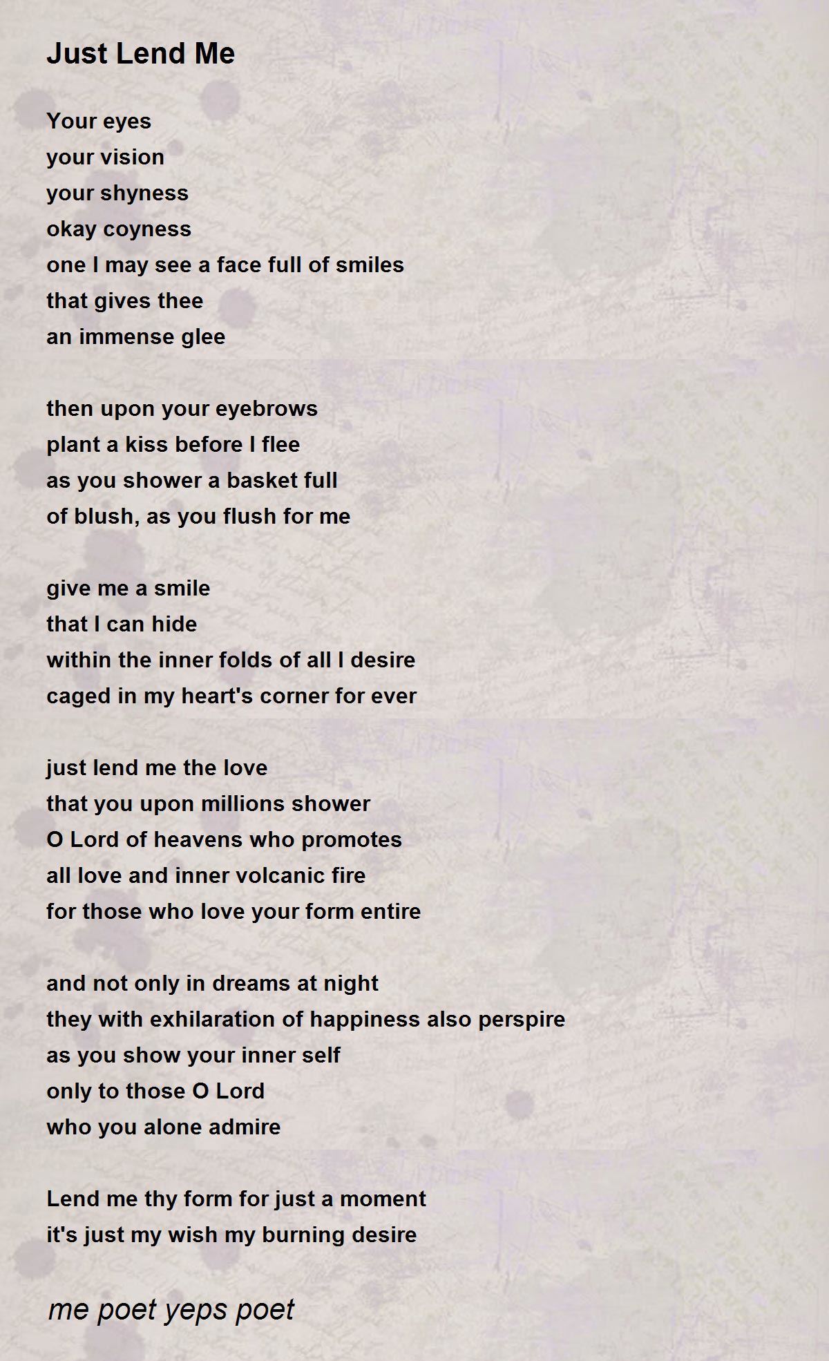 Very strong poem of artistic mastary....romantic by nature..Lend me thy form for just a moment it's just my wish my burning desire... excellent poem...