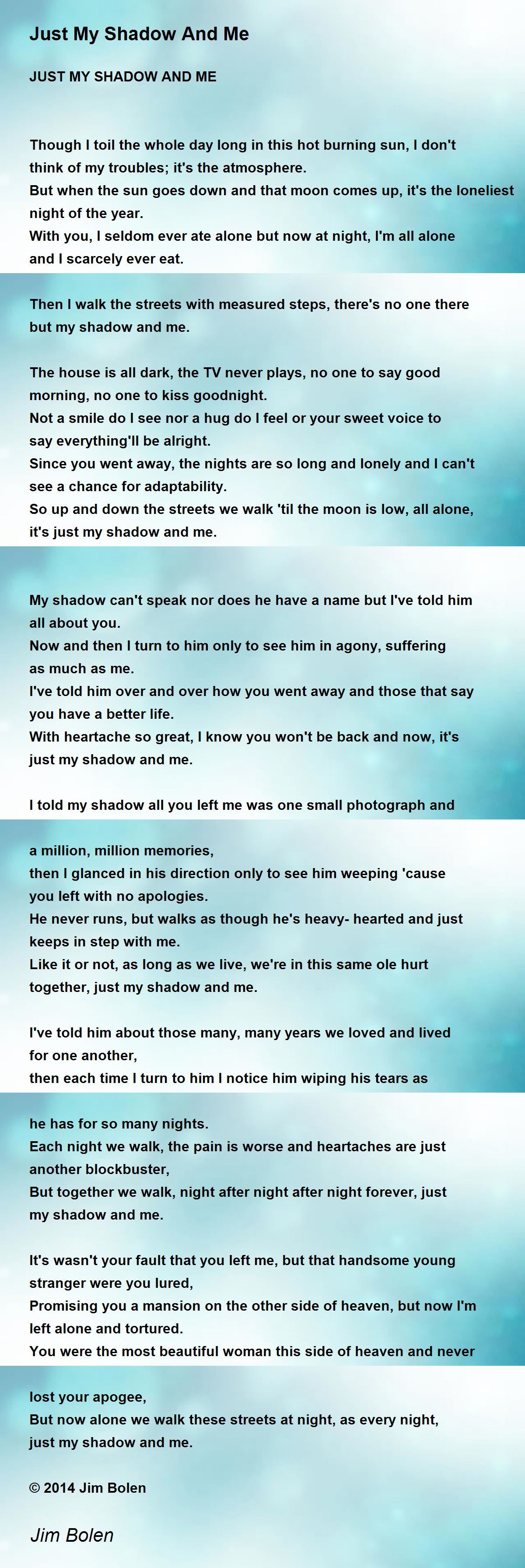 But now alone we walk these streets at night, as every night, just my shadow and me.