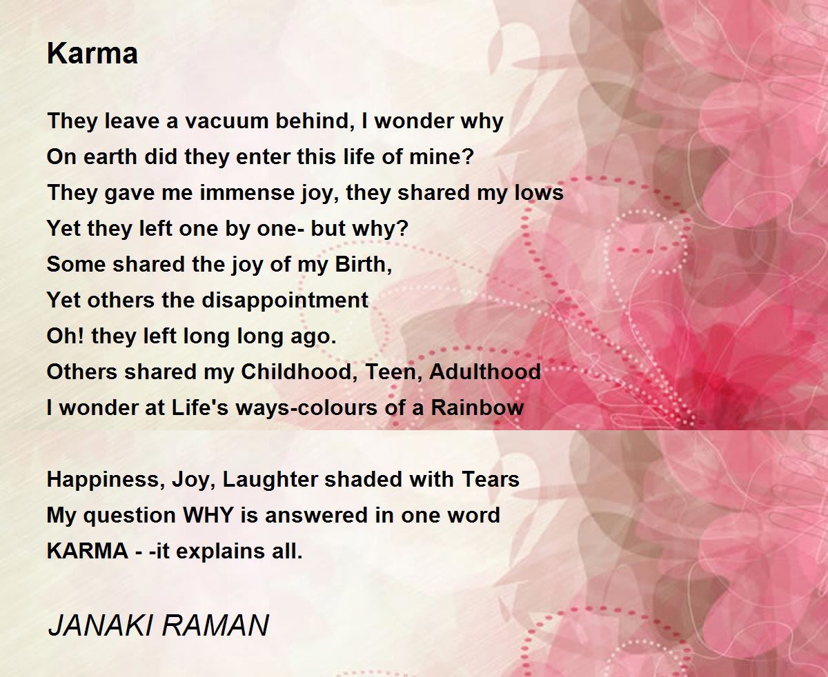 Others shared my Childhood, Teen, Adulthood I wonder at Life's ways-colours of a Rainbow Happiness, Joy, Laughter shaded with Tears.... yes Karma. i agree...... but when it comes to think that one cannot escape the Karma, i break down....... how so? ? can i not break this circle of karma..........am i sooooooo helpless? ? so many questions arise in the mind dear poetess. tony