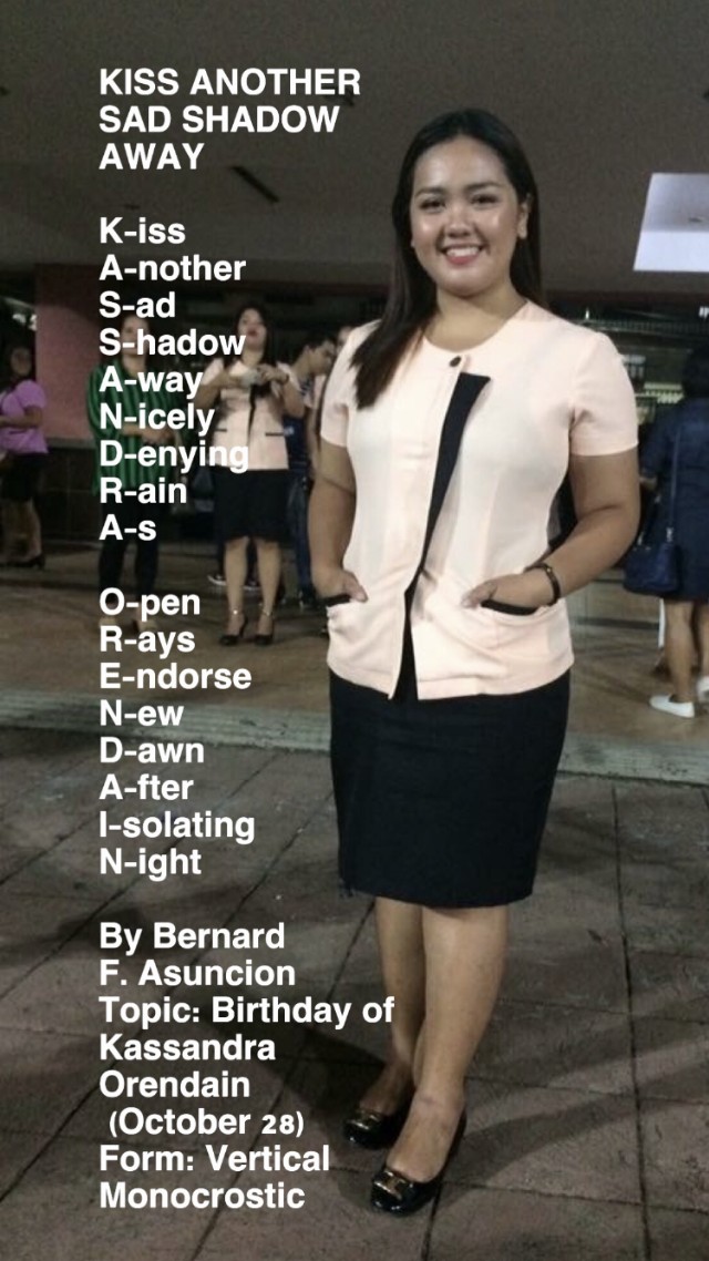 Loveliest said for a Beautiful face full of glamour. You conjured Magic from your Magic Box full of Vertical Mono-crostics. Thank you so much for sharing this beautiful BirthDay brevity, Bernard. A 10 full Vote. G.B.U and your beloved family.