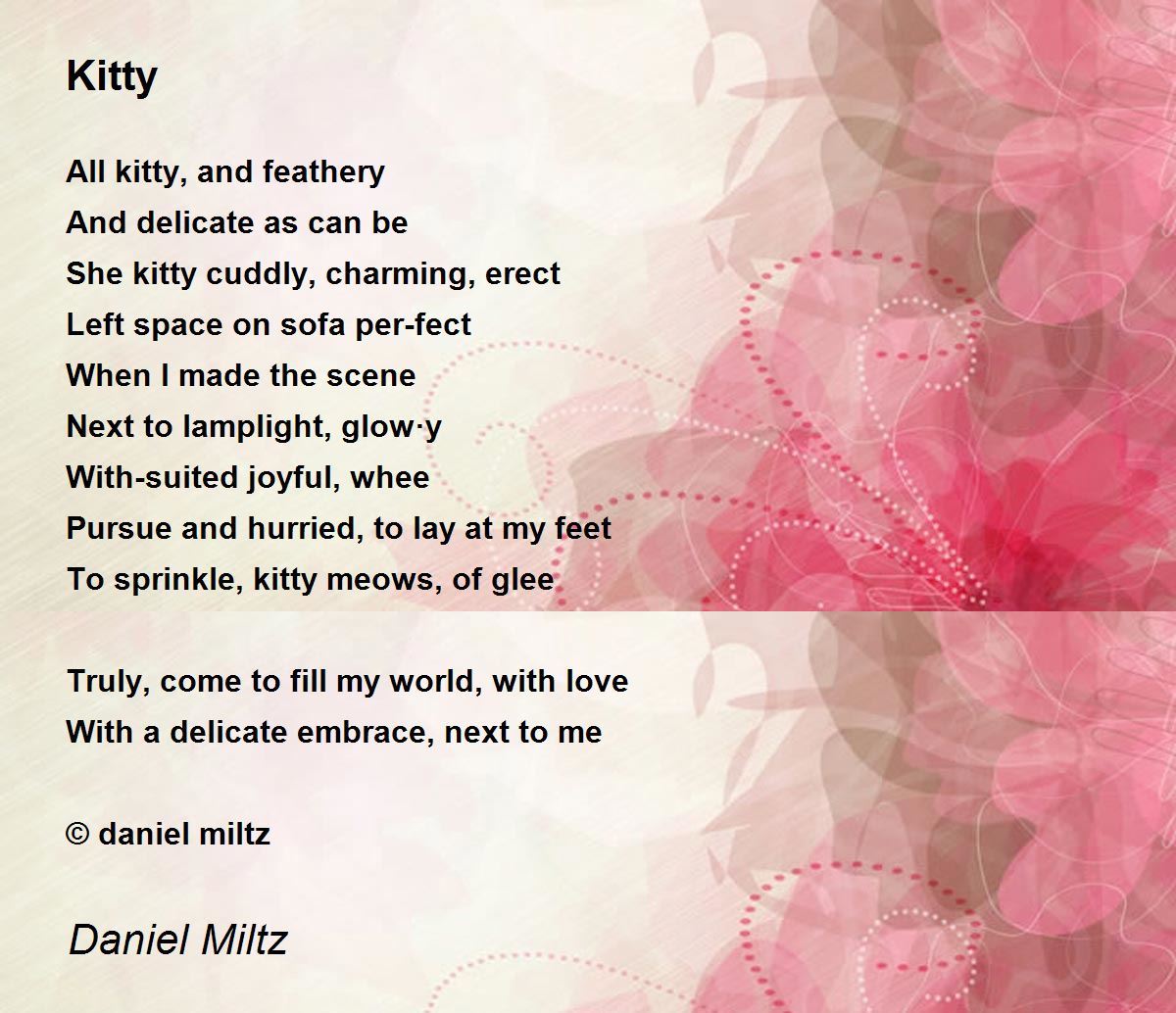 With-suited joyful, whee Pursue and hurried, to lay at my feet To sprinkle, kitty meows, of glee Truly, come to fill my world, with love With a delicate embrace, next to me........love of Kitty is well expressed. A beautiful poem is amazingly shared. Thanks for sharing.