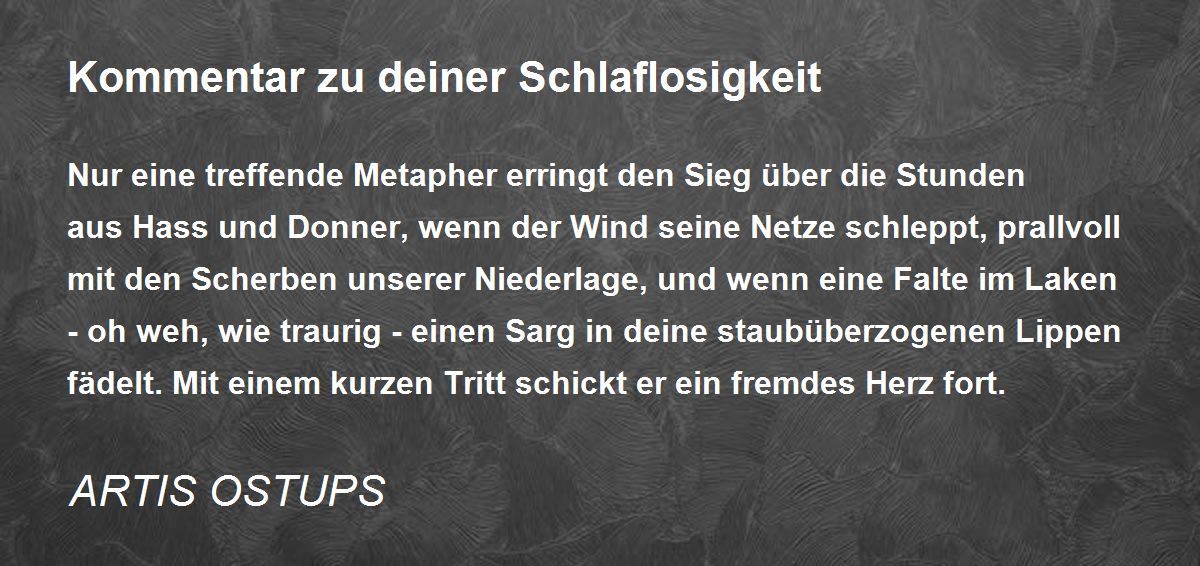 Nur eine treffende Metapher erringt den Sieg über die Stunden aus Hass und Donner, wenn der Wind seine Netze schleppt, prallvoll mit den Scherben unserer Niederlage, und wenn eine Falte im Laken - oh weh, wie traurig - einen Sarg in deine staubüberzogenen Lippen fädelt. Mit einem kurzen Tritt schickt er ein fremdes Herz fort.
