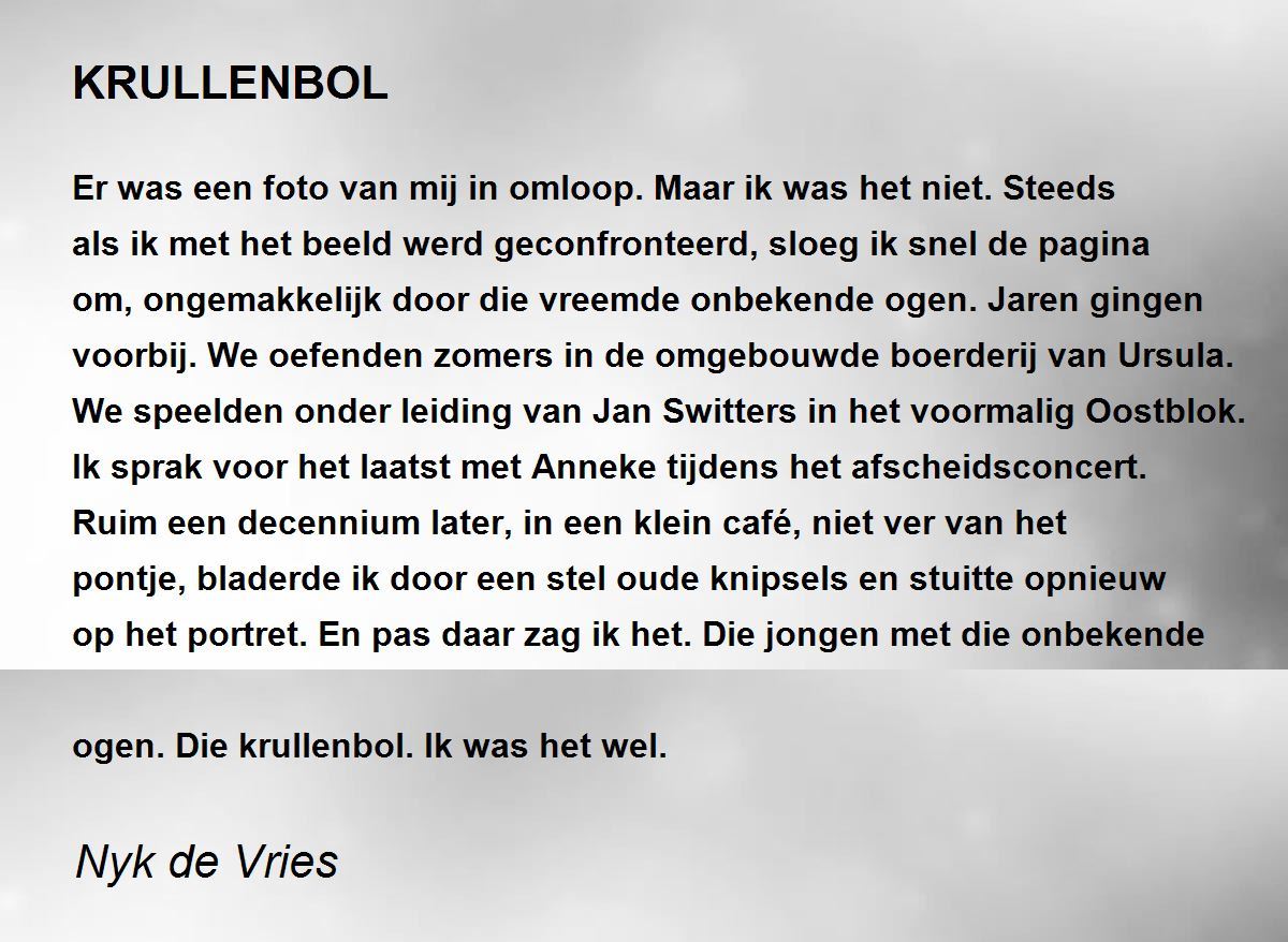 Er was een foto van mij in omloop. Maar ik was het niet. Steeds als ik met het beeld werd geconfronteerd, sloeg ik snel de pagina om, ongemakkelijk door die vreemde onbekende ogen. Jaren gingen voorbij. We oefenden zomers in de omgebouwde boerderij van Ursula. We speelden onder leiding van Jan Switters in het voormalig Oostblok. Ik sprak voor het laatst met Anneke tijdens het afscheidsconcert. Ruim een decennium later, in een klein café, niet ver van het pontje, bladerde ik door een stel oude knipsels en stuitte opnieuw op het portret. En pas daar zag ik het. Die jongen met die onbekende ogen. Die krullenbol. Ik was het wel.