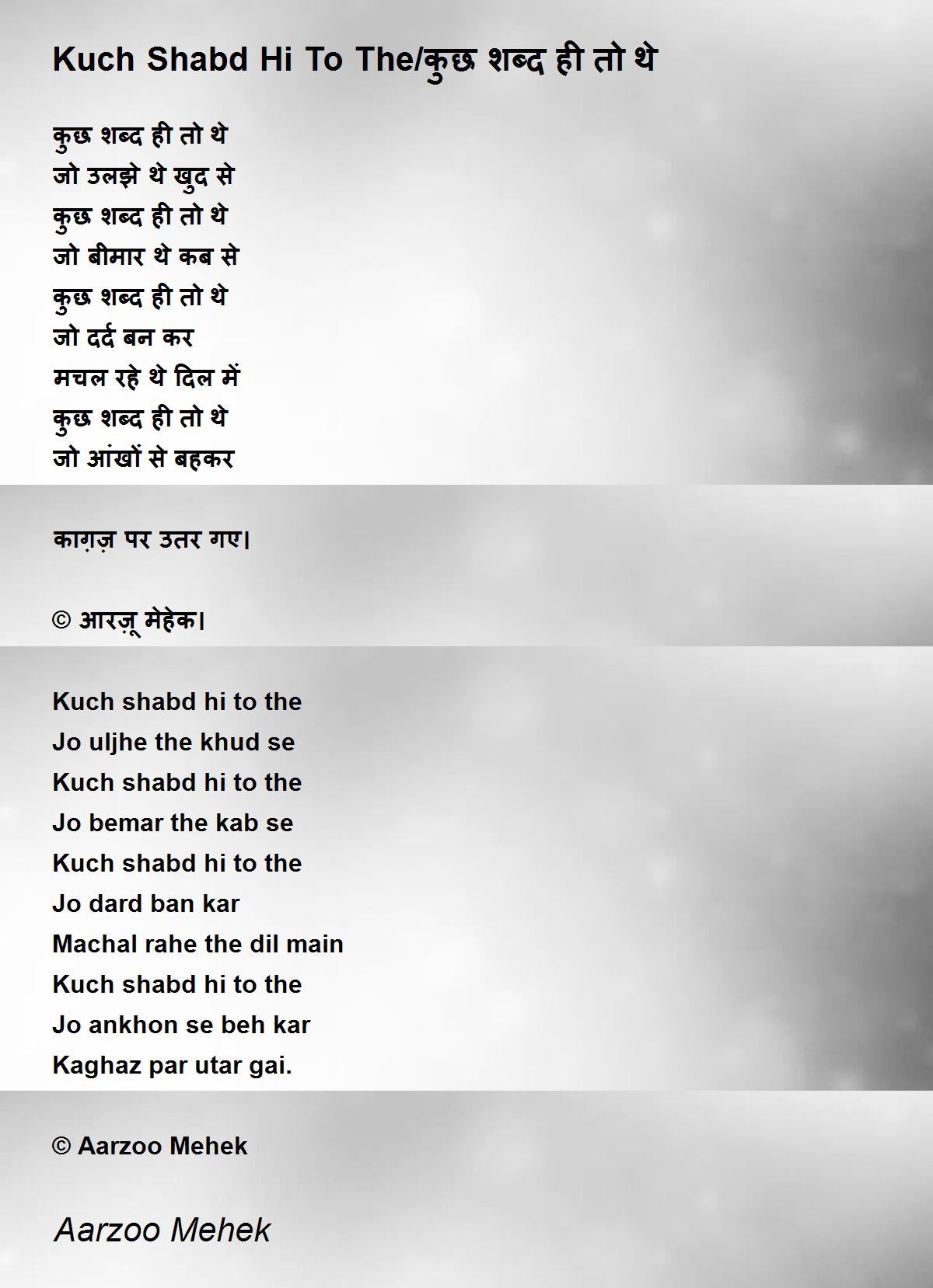 Wo shabd he to hai Jo ji choo gaye Chahe aaj ho ya kal Dil me ghar kar gaye Wo shabd he to hai Jo lavz bann gaye Kaanoon se utarkar Zahen ko choo gaye Na jane kab zindagi Ka ehsas ban gaye. Beautiful words.