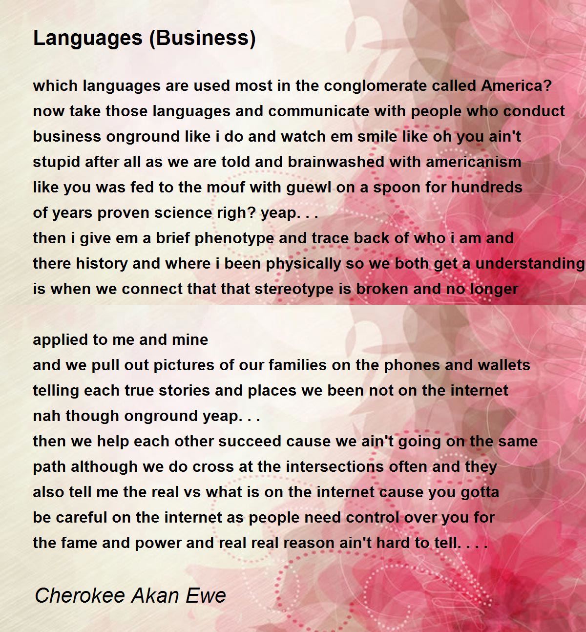 now take those languages and communicate with people who conduct business onground like i do and watch em smile like oh you ain't stupid after all as we are told and brainwashed with americanism like you was fed to the mouf with guewl on a spoon for hundreds of years proven science righ? yeap...
