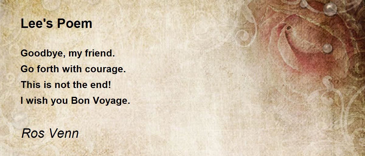 Goodbye, my friend. Go forth with courage. This is not the end! I wish you Bon Voyage.
