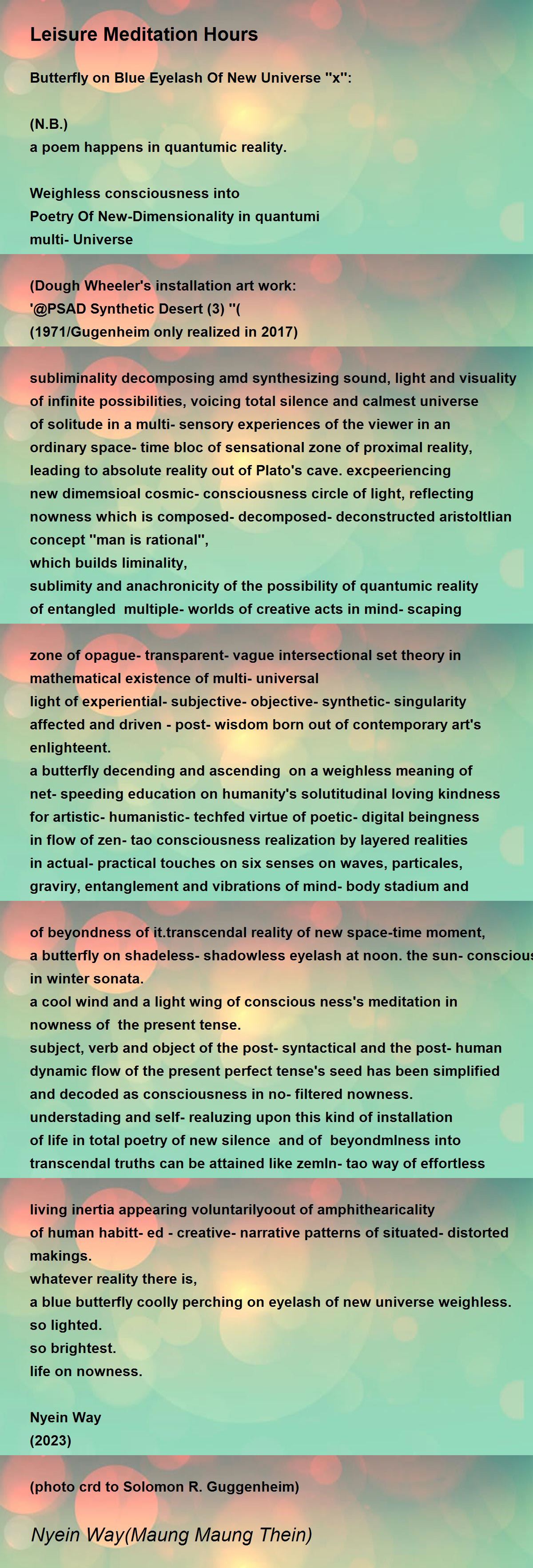 a butterfly decending and ascending on a weighless meaning of net-speeding education on humanity's solutitudinal loving kindness for artistic-humanistic-techfed virtue of poetic-digital beingness in flow of zen-tao consciousness realization by layered realities in actual-practical touches on six senses on waves, particales, graviry, entanglement and vibrations of mind-body stadium and