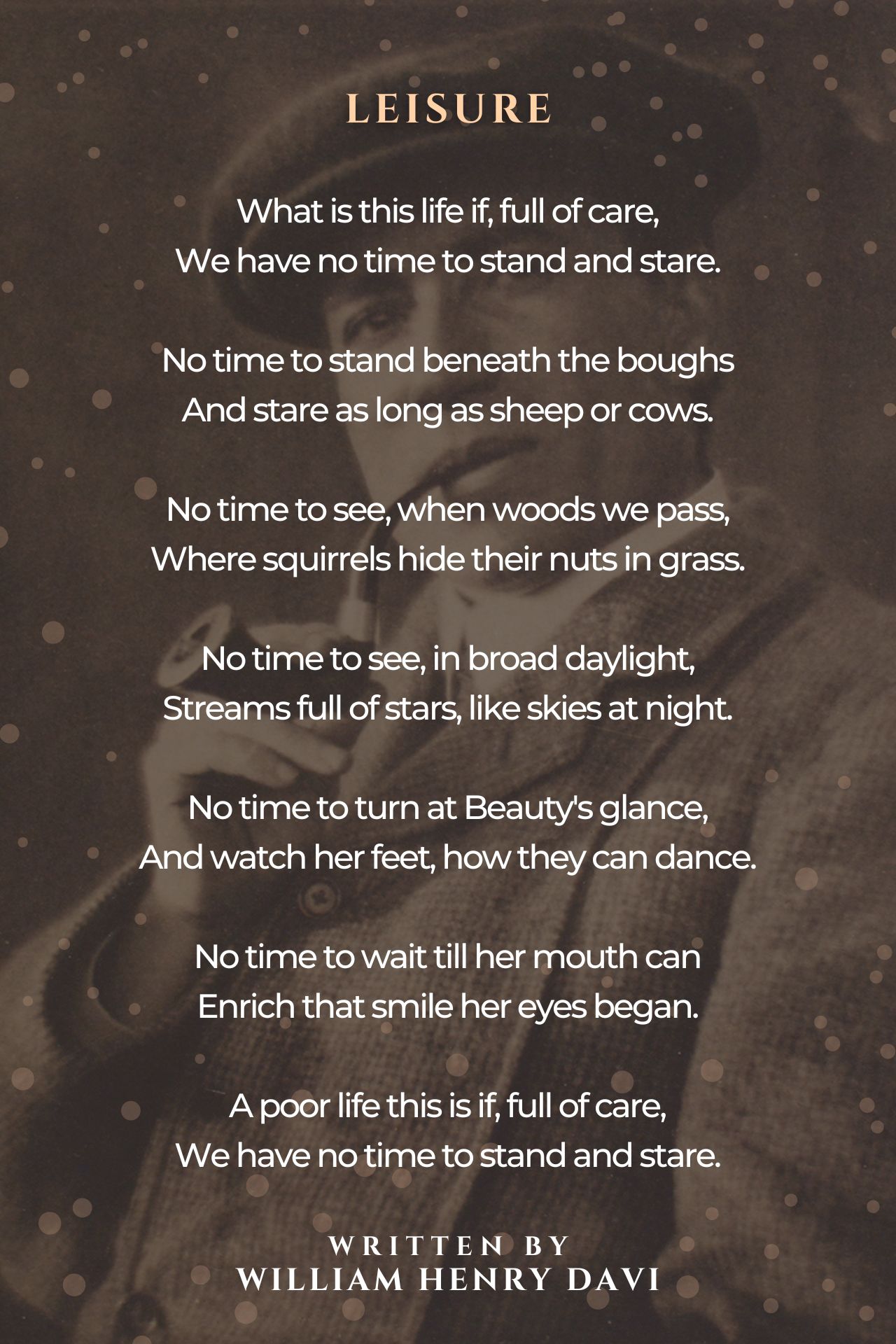 • ‘Leisure’ is a simple yet beautiful and thought provoking poem written by William Henry Davies (W. H. Davies) . In this poem, the poet wonders whether it is worth leading a life which provides one with no time for leisure. • • The poem ‘Leisure’ is divided into seven rhyming couplets. • • Couplet 1: • • The poet, W. H. Davies, begins by questioning the purpose of a life which is so full of worry that it does not allow us any time to simply stand still and watch the world go by. • • In the next few couplets, he describes the various things that people are not able to do due to lack of leisure. • • Couplet 2: • • Sheep and cows can often be seen standing still in vast open fields and staring into a distance. People living a busy life would not posses the leisure to stand under the branches of trees and keep gazing on and on like such ruminants. • • Couplet 3: • • W. H. Davies further adds that when such people pass a forest or a woodland, they would be in too much of a hurry to notice the nooks and crannies in the grass where squirrels conceal their nuts. They would not posses the leisure to notice the various aspects of the natural world around them. • • Couplet 4: • • In daylight, streams appear to be sparkling under the effect of sunshine making it seem as if the streams are full of stars like the night sky. However, such beauties of nature are likely to be missed by people overburdened by anxiety and living a life of haste without any leisure, remarks W.H. Davies. • • Couplets 5 and 6: • • There are two ways of looking at the fifth and sixth couplets of the poem: literally and metaphorically. • • Looking at it literally- The poet states that the rush of life provides people with no leisure to turn at the glance of a beautiful maiden and marvel at her dancing feet. • • They are unable to leisurely observe her as her mouth shapes out a smile that started from her eyes. • • Looking at it metaphorically- W.H. Davies has personified the beauty of the world around us which many often fail to observe due to a lack of leisure. The dancing feet and enchanting smile refers to various aspects of the beauty around us. • • Couplet 7: • • In the final couplet of the poem, Davies states that a life which is so bogged down by worry that it allows one no time for leisure is indeed a miserable life. If you read the first couplet of ‘Leisure’ carefully, you will notice that although it ends with a full stop, (and is hence in the form of a statement) it can also be interpreted as a question asked by the poet. In that case, the final couplet can be seen as W. H. Davies’ answer to his own question.