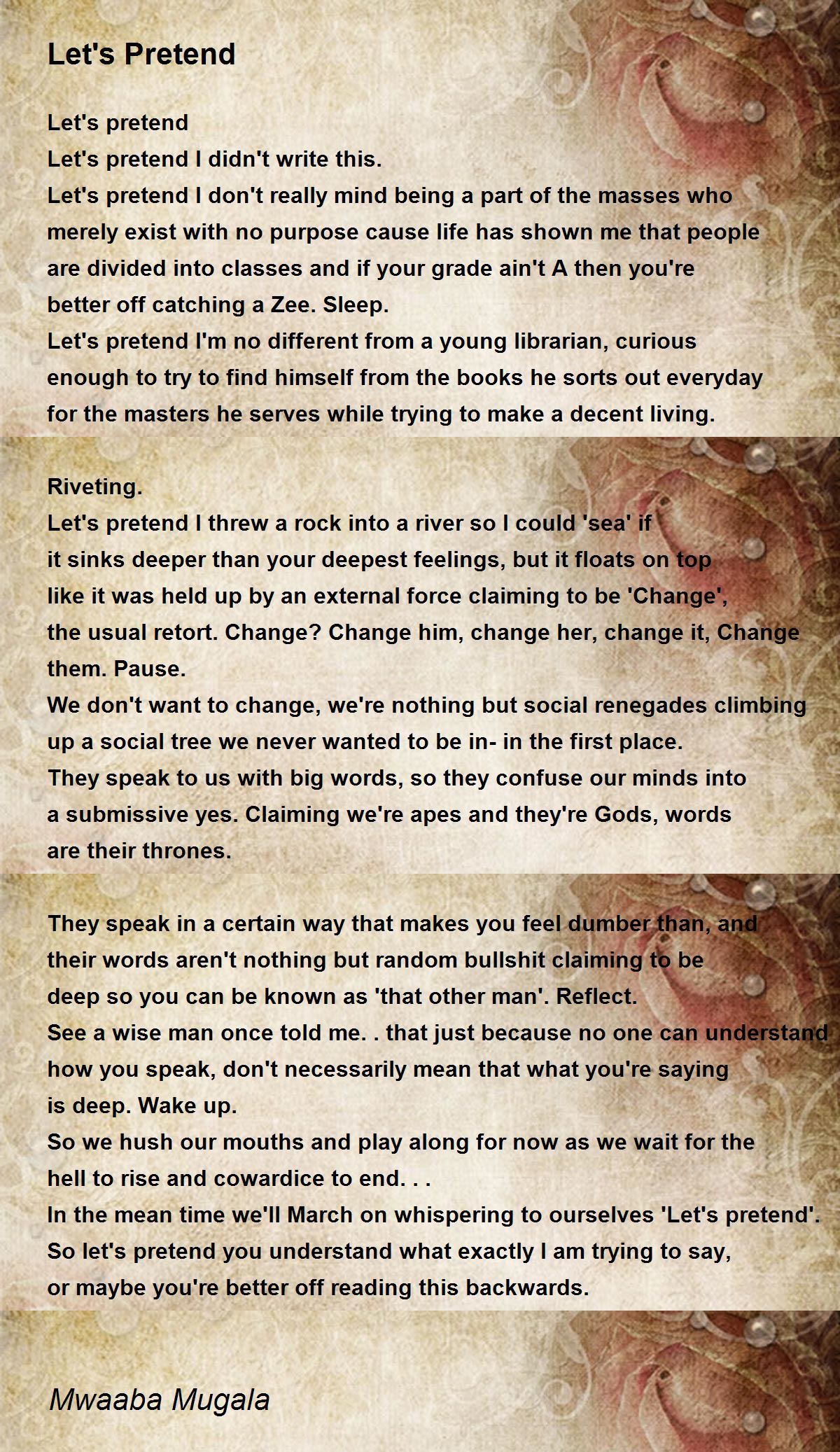 Let's pretend I threw a rock into a river so I could 'sea' if it sinks deeper than your deepest feelings, but it floats on top like it was held up by an external force claiming to be 'Change', the usual retort. Change? Change him, change her, change it, Change them. Pause.