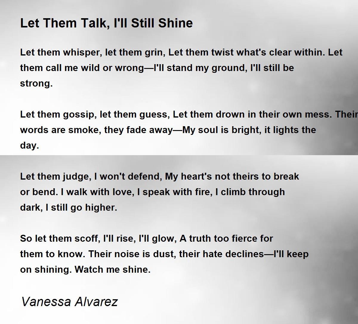 So let them scoff, I'll rise, I'll glow, A truth too fierce for them to know.Their noise is dust, their hate declines—I'll keep on shining. Watch me shine.