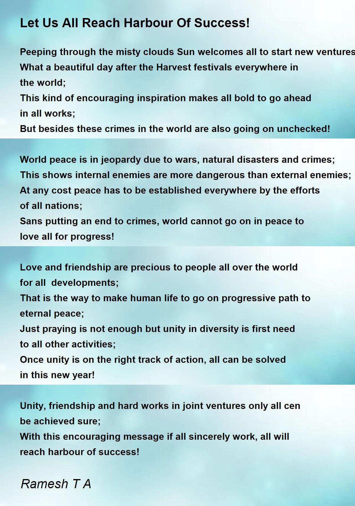 Unity, friendship and hard works in joint ventures only all cen be achieved sure; With this encouraging message if all sincerely work, all will reach harbour of success!