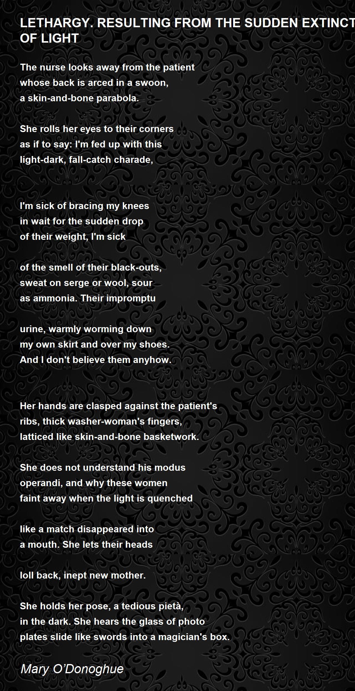 She holds her pose, a tedious pietà,