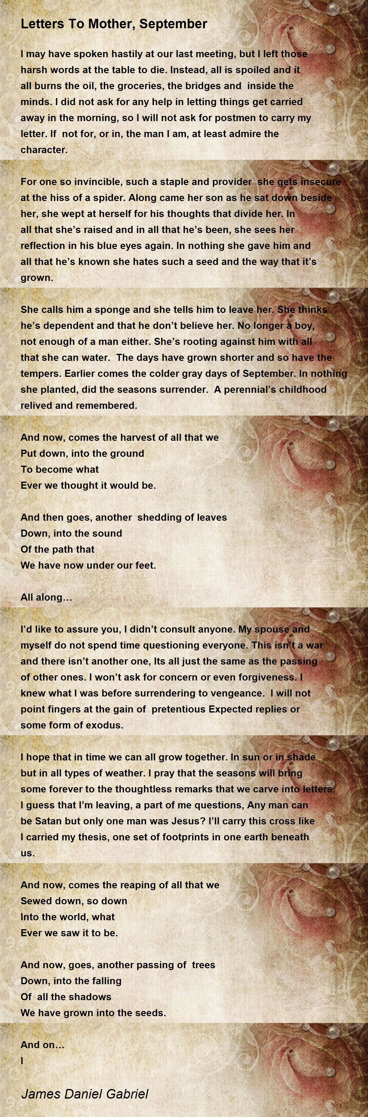 I may have spoken hastily at our last meeting, but I left those harsh words at the table to die. Instead, all is spoiled and it all burns the oil, the groceries, the bridges and inside the minds. I did not ask for any help in letting things get carried away in the morning, so I will not ask for postmen to carry my letter. If not for, or in, the man I am, at least admire the character.