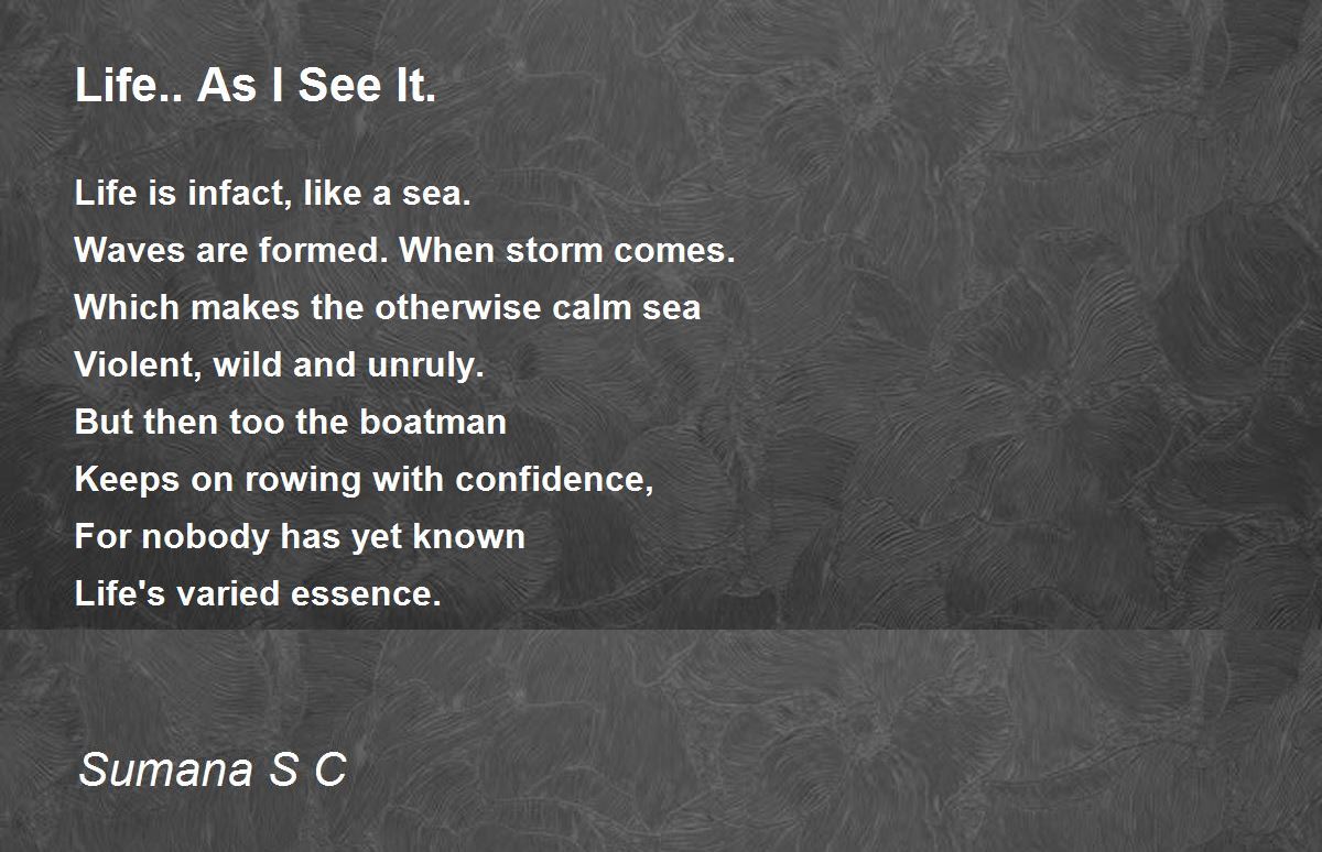 But then too the boatman Keeps on rowing with confidence, For nobody has yet known Life's varied essence. the last verse is real wisdom uttered by you the poet. thanku. tony