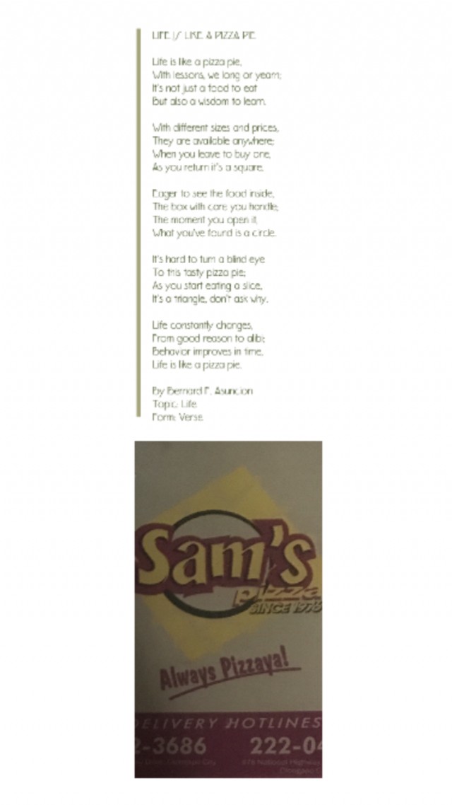 Your life is like a pizza pie, With wisdom you should long or yearn; It is not just a food to eat, But also a lesson to learn. A distinctive poem, sir Bernard.