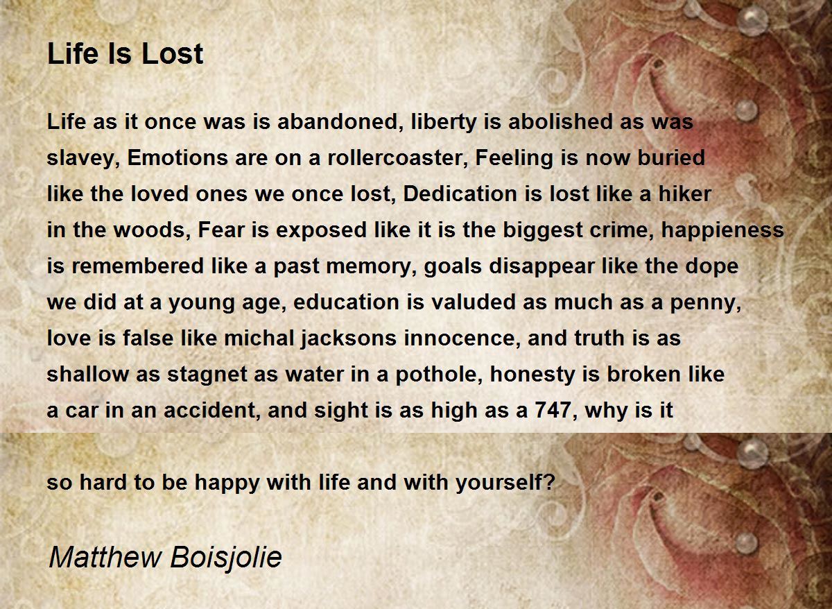 Life as it once was is abandoned, liberty is abolished as was slavey, Emotions are on a rollercoaster, Feeling is now buried like the loved ones we once lost, Dedication is lost like a hiker in the woods, Fear is exposed like it is the biggest crime, happieness is remembered like a past memory, goals disappear like the dope we did at a young age, education is valuded as much as a penny, love is false like michal jacksons innocence, and truth is as shallow as stagnet as water in a pothole, honesty is broken like a car in an accident, and sight is as high as a 747, why is it so hard to be happy with life and with yourself?