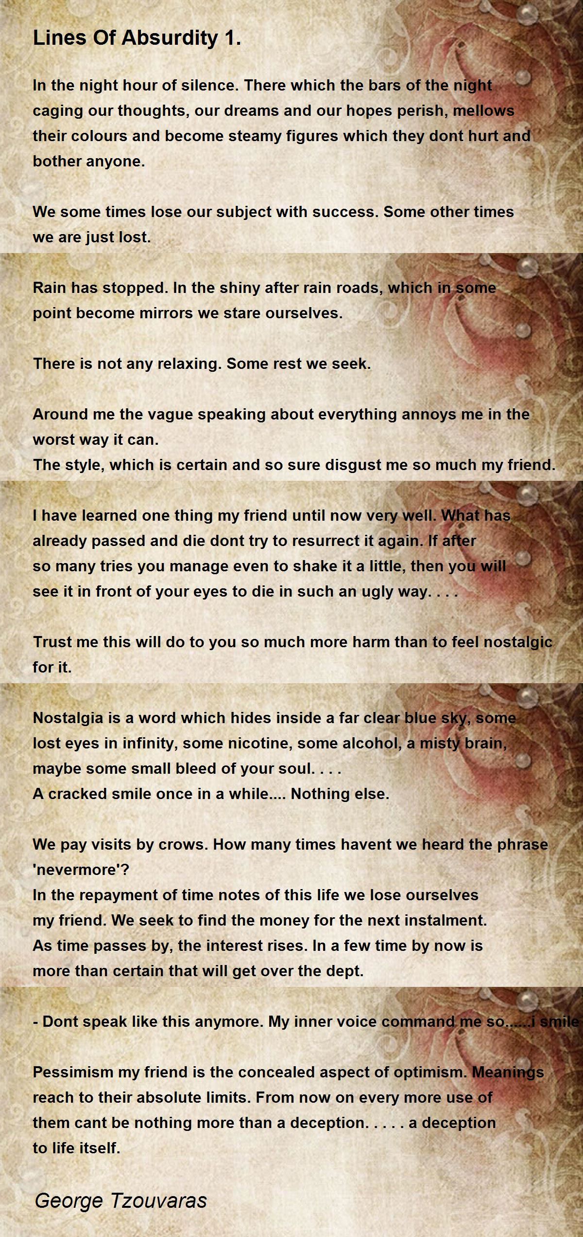 In the night hour of silence. There which the bars of the night caging our thoughts, our dreams and our hopes perish, mellows their colours and become steamy figures which they dont hurt and bother anyone.