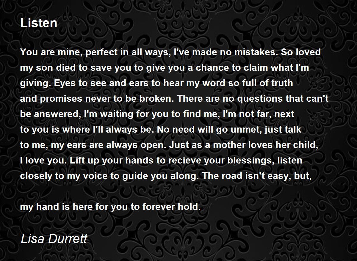 You are mine, perfect in all ways, I've made no mistakes. So loved my son died to save you to give you a chance to claim what I'm giving. Eyes to see and ears to hear my word so full of truth and promises never to be broken.There are no questions that can't be answered, I'm waiting for you to find me, I'm not far, next to you is where I'll always be.No need will go unmet, just talk to me, my ears are always open. Just as a mother loves her child, I love you. Lift up your hands to recieve your blessings, listen closely to my voice to guide you along.The road isn't easy, but, my hand is here for you to forever hold.