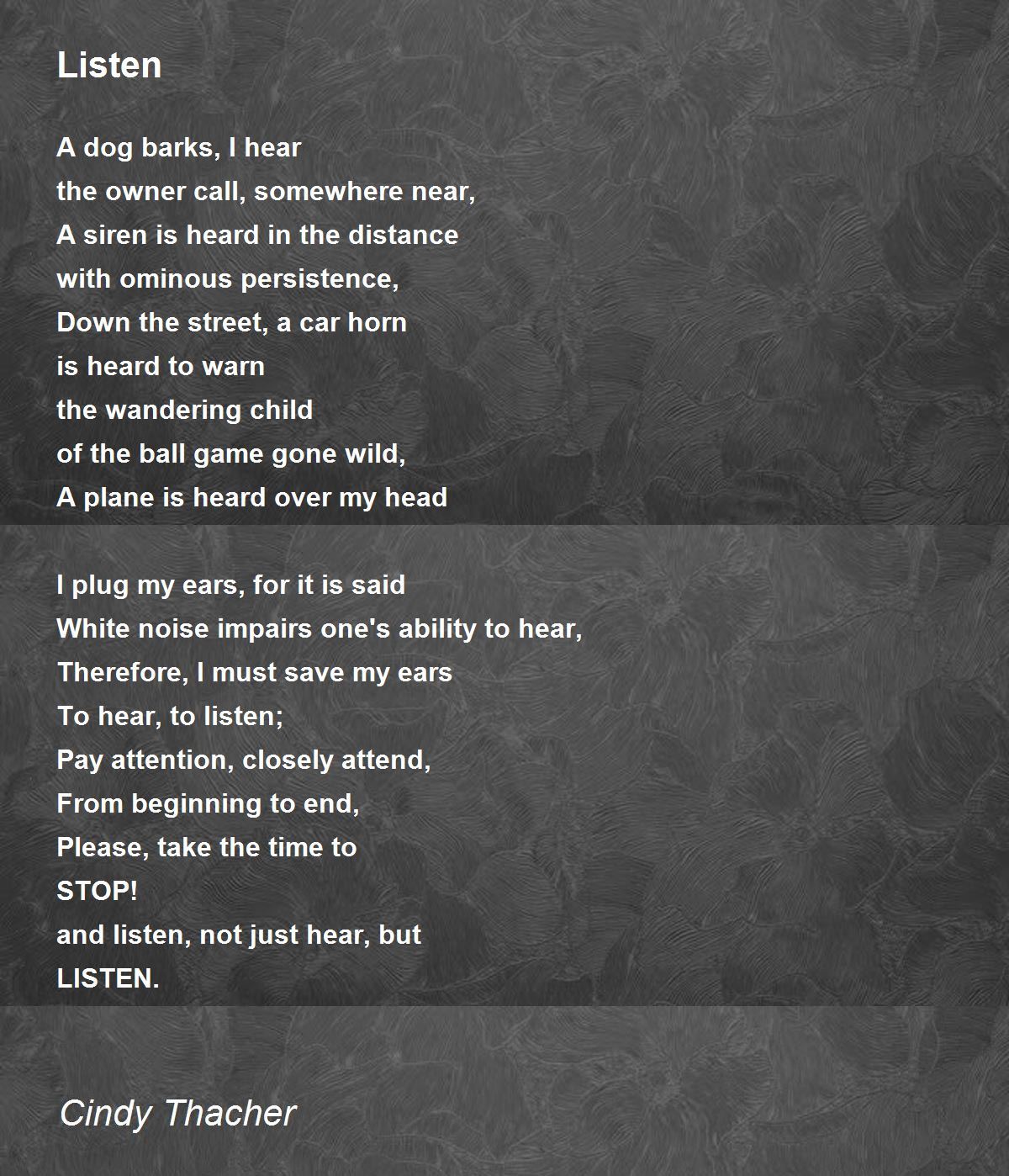 Wow, Cindy, this a great piece, well penned, keep it up! You got talent! I hope you can check my poem also titled 'LISTEN' and 'LISTEN TO ME ONE MORE TIME', for your poem: 10+++