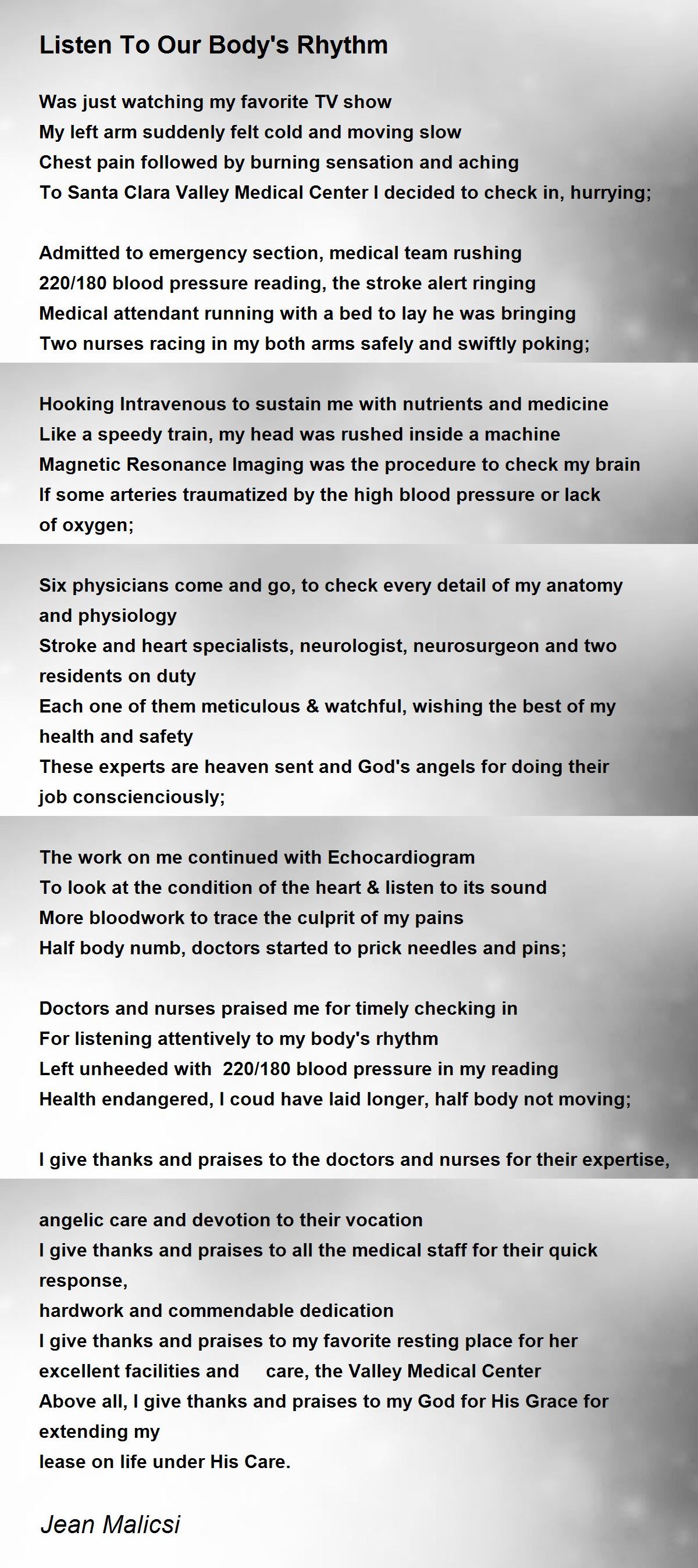 Six physicians come and go, to check every detail of my anatomy and physiology