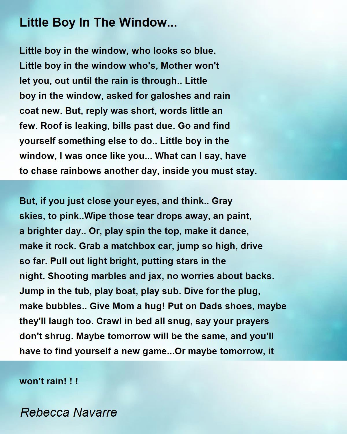 Oh, did that bring back memmories! ! ! Of being both the child gazing sadly out the window and being the parent trying to think up things for the child to do that would distract and put a smile on his face [personally I always got down on the floor and played with them and we had a great time but I always was a bit on the childish side... hehehe]. I love the texture of this poem- it is made from reality and shows a characterization of both child and mother through her words. You know what- -we Moms don't get enough credit! ! ! ! Beautiful work here- -10++++++++