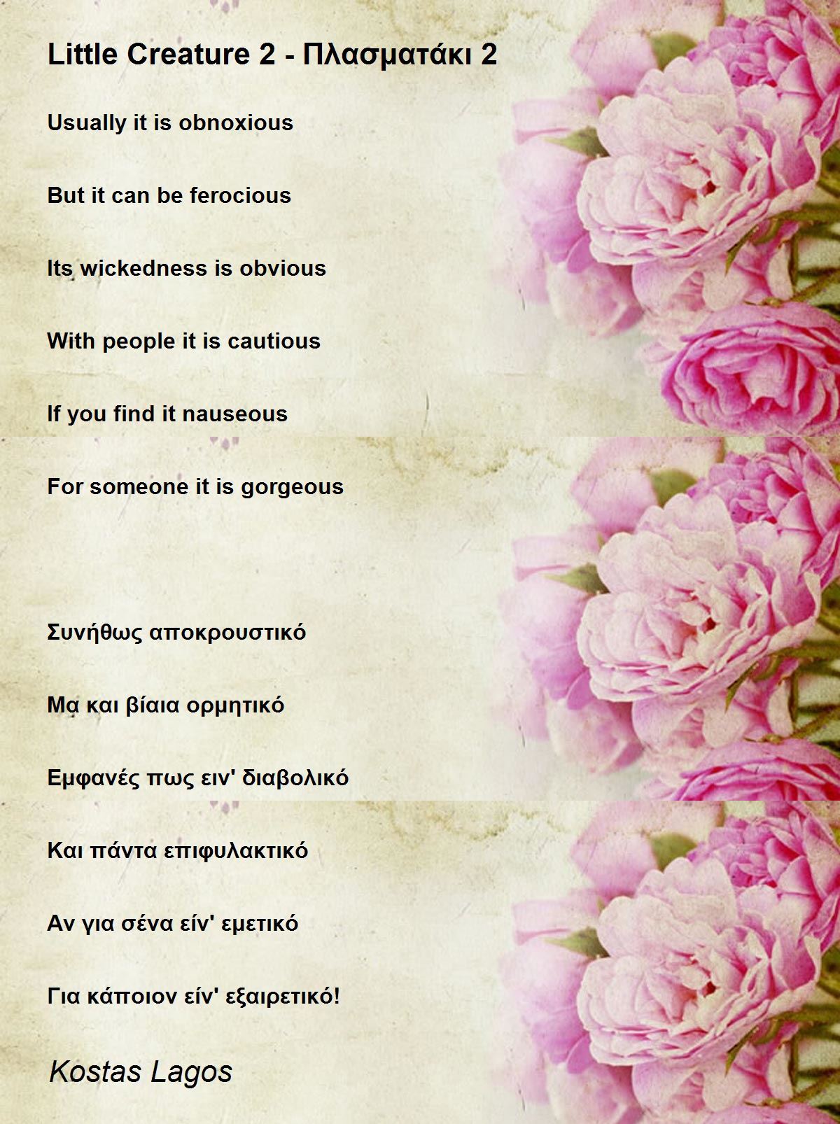 Dear friend Kostas, Hello thanks for this wonderful poem, the evilness doesn't know the size, but most of the creatures scare of the evilness of mankind, they are friendly while we are treating them gently, well done and have a top mark 10++ Excellent piece of work