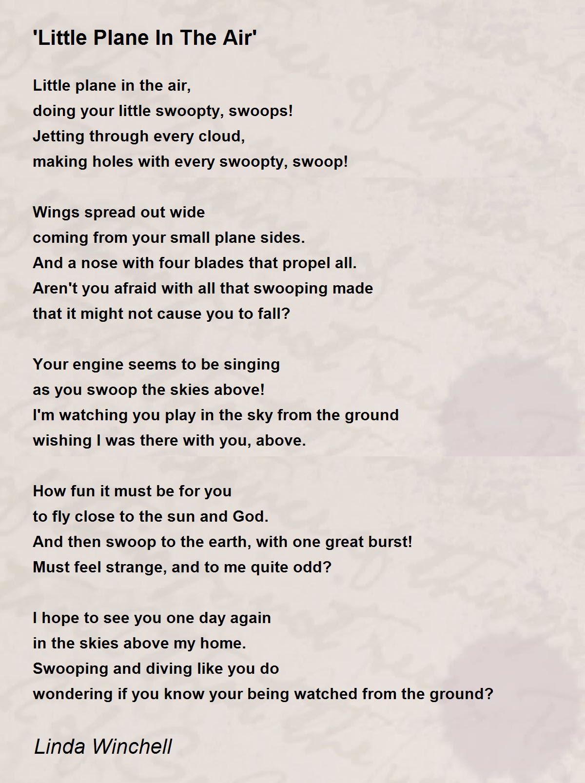 Awww this is so cute Linda. Yes, every time a plane flies over I watch it speed out of sight. In all of my years there is one thing that constantly keeps me in awe. That something so heavy can fly through the sky like a bird. This is a wonderful poem, and rates a 10 from me. Love & hugs, Your sister in Christ our Lord, Barbara