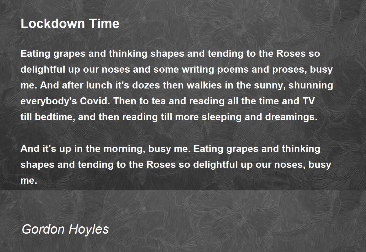 Eating grapes and thinking shapes and tending to the Roses so delightful up our noses and some writing poems and proses, busy me.And after lunch it's dozes then walkies in the sunny, shunning everybody's Covid.Then to tea and reading all the time and TV till bedtime, and then reading till more sleeping and dreamings.
