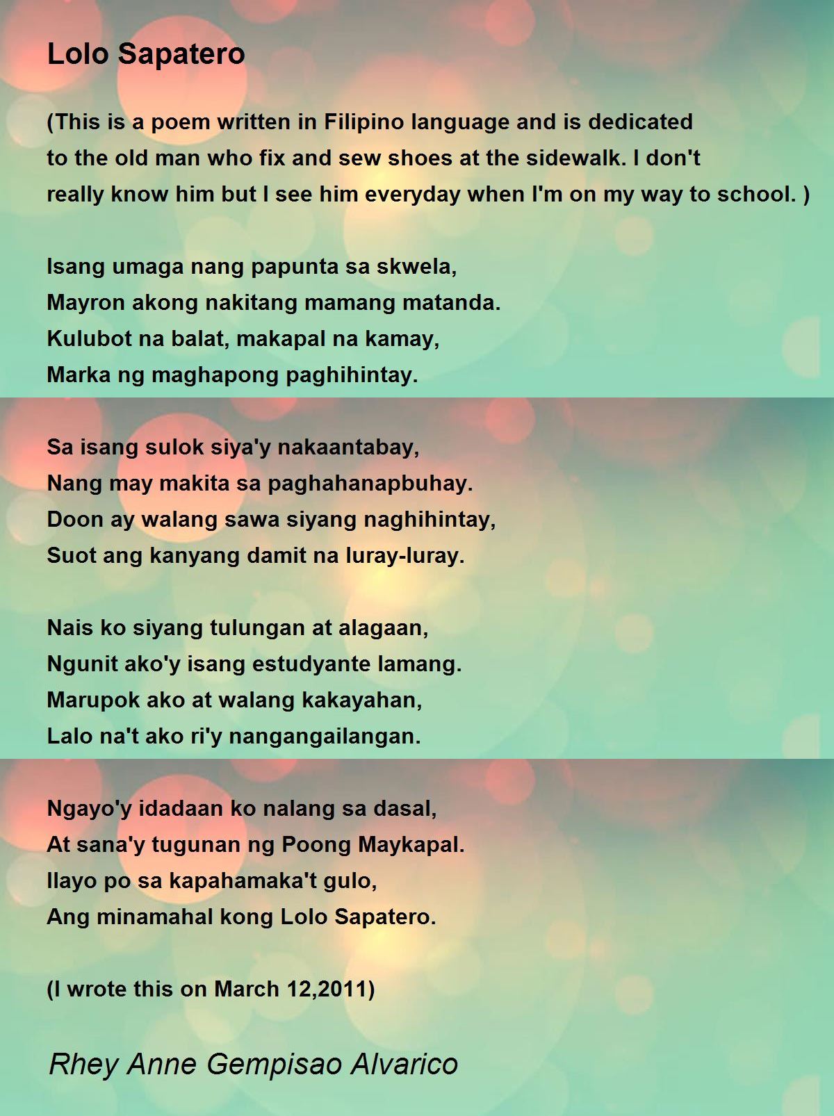 (This is a poem written in Filipino language and is dedicated to the old man who fix and sew shoes at the sidewalk. I don't really know him but I see him everyday when I'm on my way to school.)