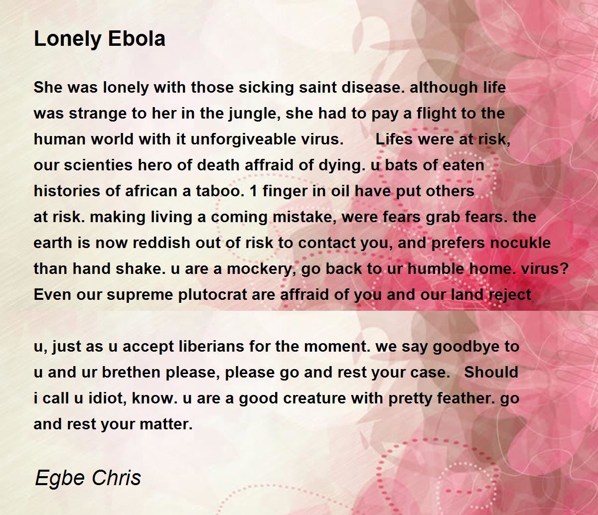 She was lonely with those sicking saint disease.although life was strange to her in the jungle, she had to pay a flight to the human world with it unforgiveable virus. Lifes were at risk, our scienties hero of death affraid of dying.u bats of eaten histories of african a taboo.1 finger in oil have put others at risk.making living a coming mistake, were fears grab fears.the earth is now reddish out of risk to contact you, and prefers nocukle than hand shake.u are a mockery, go back to ur humble home.virus? Even our supreme plutocrat are affraid of you and our land reject u, just as u accept liberians for the moment.we say goodbye to u and ur brethen please, please go and rest your case. Should i call u idiot, know.u are a good creature with pretty feather.go and rest your matter.