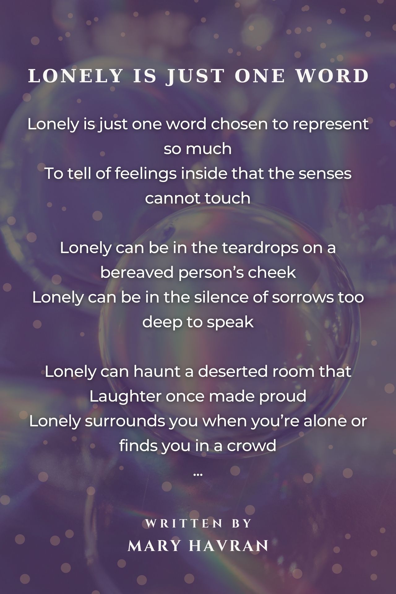 Awesome Poem Mary, Lonely could be anyones bittersweet companion, a familiar friend, You can be surrounded by so many people and still feel lonely.