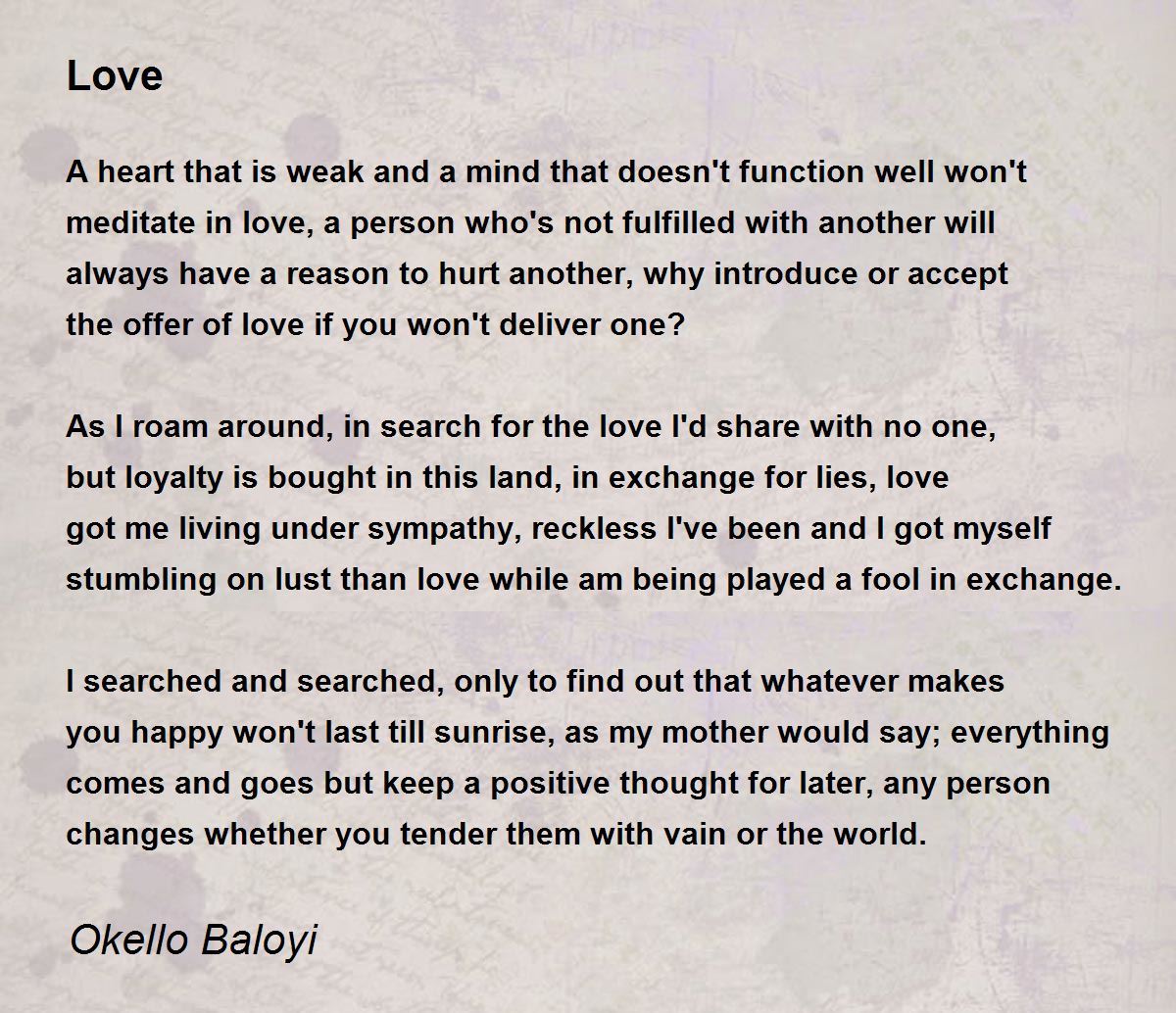 A heart that is weak and a mind that doesn't function well won't meditate in love, a person who's not fulfilled with another will always have a reason to hurt another, why introduce or accept the offer of love if you won't deliver one?