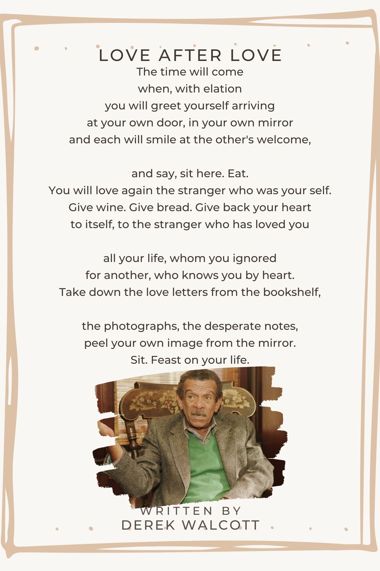 Really: The title gives it away! It is about over-coming the grief of a broken love-affair, and finding the love which you thought was lost for ever; the love you ignored for another (the love you once received from another human being) . The author suggests throwing away the photographs of your ex-lover, together with the desperate notes you exchanged hoping to rekindle that broken love affair, and the old love letters you have collected. After that Love there is another Love to be found. You will love against the stranger who was yourself. This poem is not only about the ending of despair and grief, but the recovery of who you once were before you gave the love in your heart away. The love after love! The recovery of your own loving kindness and self-esteem. If there is no one else, you can begin to take care of yourself, at least! However this is a Christian evangelical poem, because wine and bread refer to the specific Christian Eucharist. I think that Derek Walcott is referring to LOVE as the Christ in you; the hope of glory and the rebirth which follows that death which we know as grief or the valley of the shadow of death, when we have lost the will to live, or faith that life is meaningful. A meaningful feast. Personally I think it does not matter what particular religion you may belong to, for ultimately all religious beliefs are about the love of God, reflected through various spiritual teachers. However this is a poem by a 'born again' Christian, isn't it? The Bible says that to find the stranger who was your self you have to become like a child, again; and I believe this is true (whether or not you belong to any religion) ! But, whether you are a monk or nun, or whatever, you will want to share that innocent love; even if just with a smile. Derek Walcott has shared it with a poem!