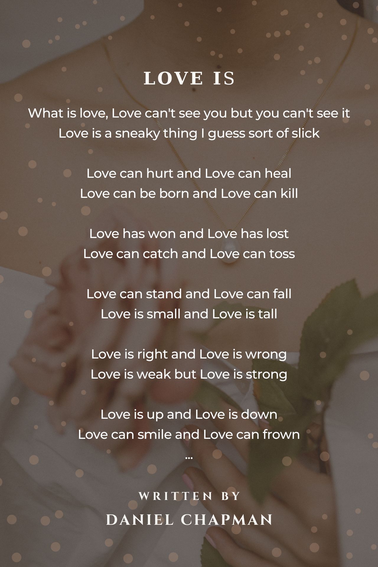 I do agree with you, dear Daniel. Love has many faces and many functions, can be described in many ways but at the end of your verses you affirm that real love comes only from above. For me the life of Jesus defines what is real love. Thank you so much for posting this.
