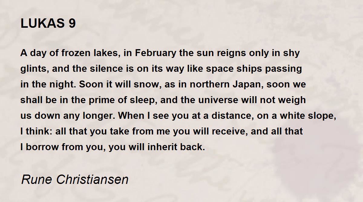 A day of frozen lakes, in February the sun reigns only in shy glints, and the silence is on its way like space ships passing in the night. Soon it will snow, as in northern Japan, soon we shall be in the prime of sleep, and the universe will not weigh us down any longer. When I see you at a distance, on a white slope, I think: all that you take from me you will receive, and all that I borrow from you, you will inherit back.