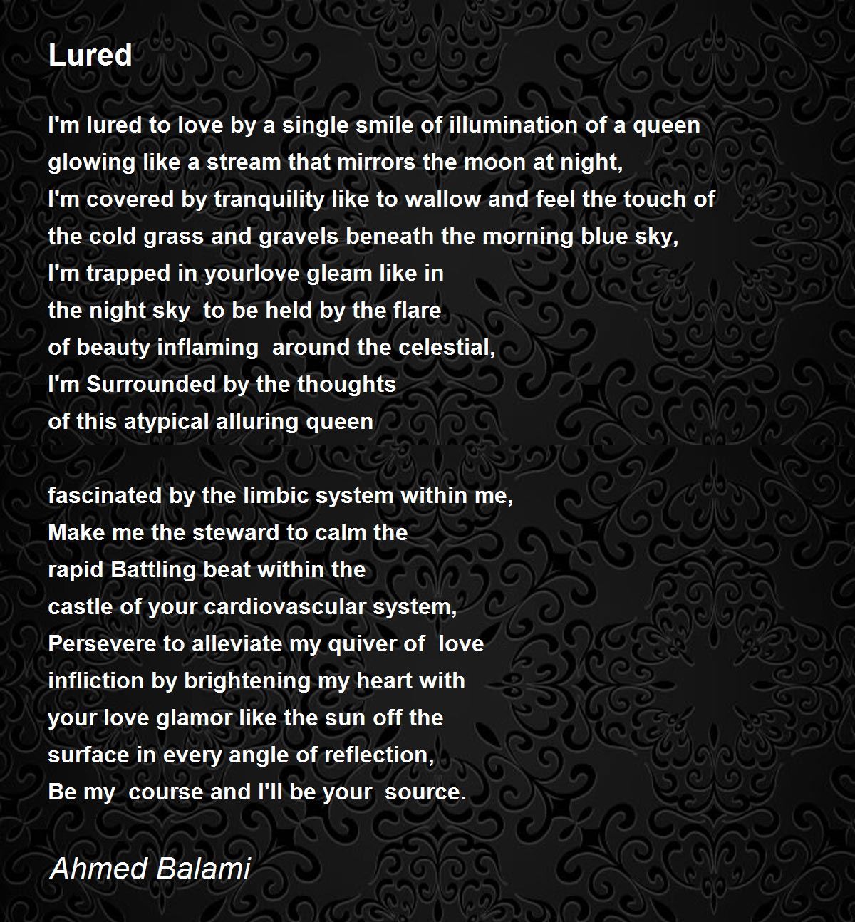 I'm lured to love by a single smile of illumination of a queen glowing like a stream that mirrors the moon at night,