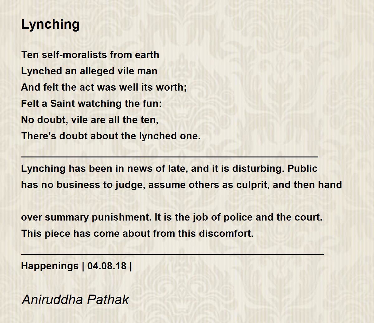 Lynching has been in news of late, and it is disturbing. Public has no business to judge, assume others as culprit, and then hand over summary punishment. It is the job of police and the court. This piece has come about from this discomfort.