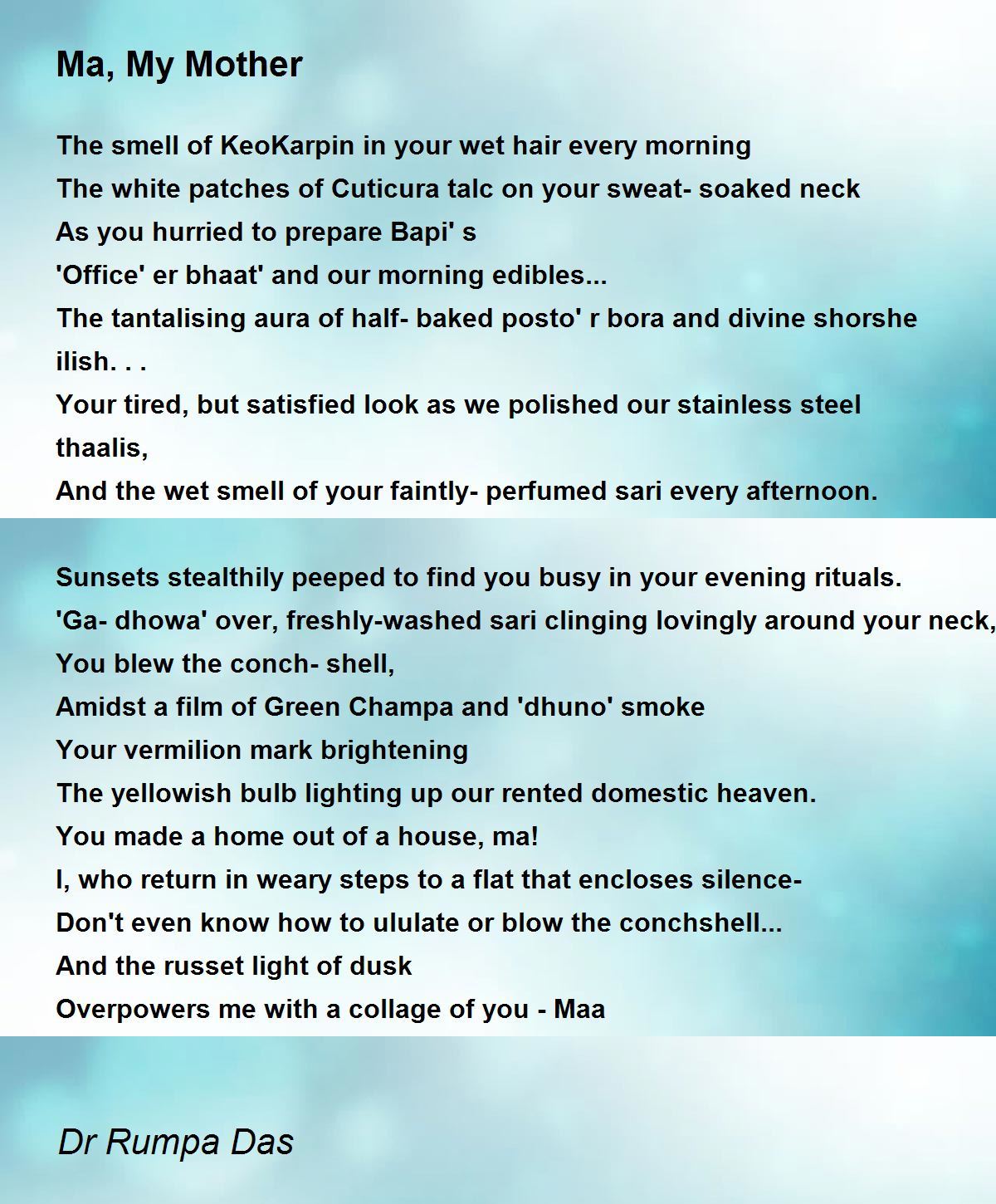 And the wet smell of your faintly- perfumed sari every afternoon.