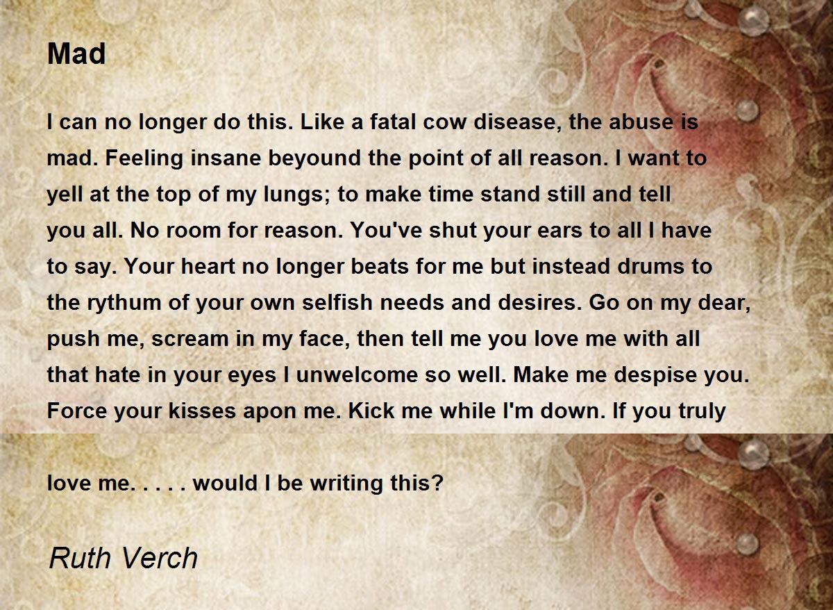 I can no longer do this. Like a fatal cow disease, the abuse is mad. Feeling insane beyound the point of all reason. I want to yell at the top of my lungs; to make time stand still and tell you all. No room for reason. You've shut your ears to all I have to say. Your heart no longer beats for me but instead drums to the rythum of your own selfish needs and desires. Go on my dear, push me, scream in my face, then tell me you love me with all that hate in your eyes I unwelcome so well. Make me despise you. Force your kisses apon me. Kick me while I'm down. If you truly love me.....would I be writing this?
