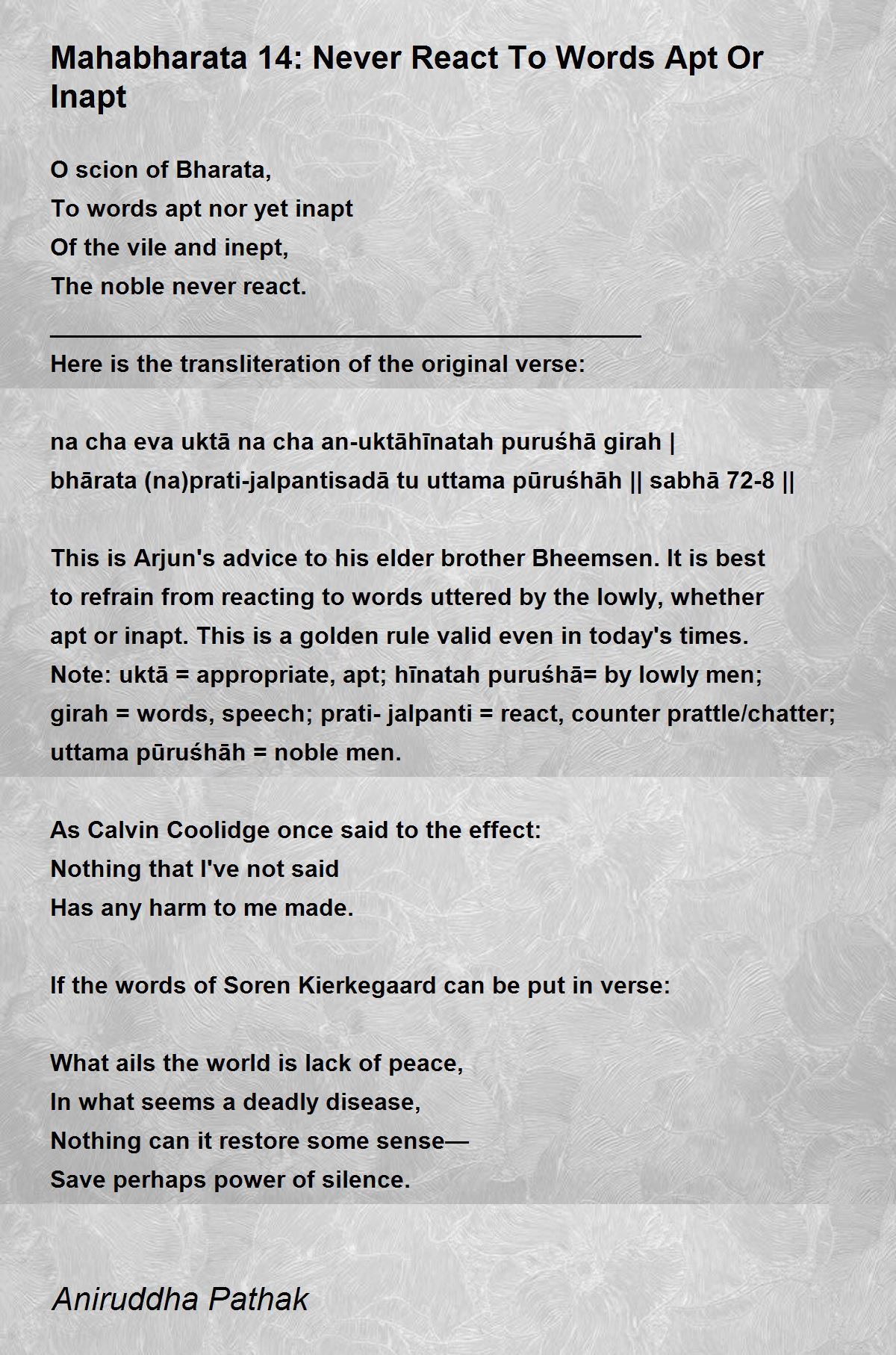 This is Arjun's advice to his elder brother Bheemsen. It is best to refrain from reacting to words uttered by the lowly, whether apt or inapt. This is a golden rule valid even in today's times. Note: uktā = appropriate, apt; hīnatah puruśhā= by lowly men; girah = words, speech; prati-jalpanti = react, counter prattle/chatter; uttama pūruśhāh = noble men.