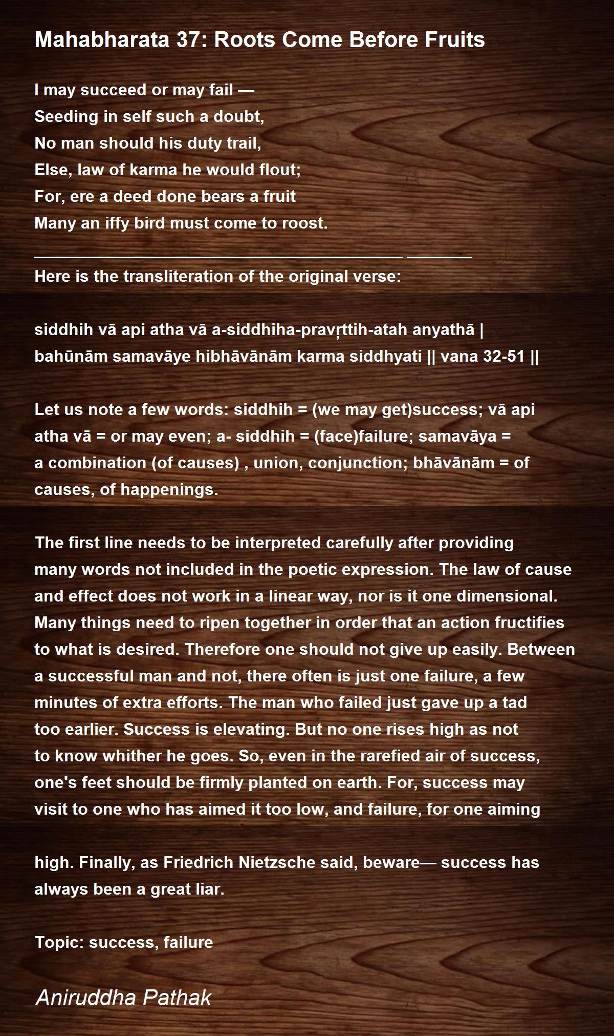 A noteworthy, philosophical gem. No man can escape the law of karma. Karana and karya exist and flow like success and failure in life. Equanimity is the key to life. Thank you Aniruddha ji.