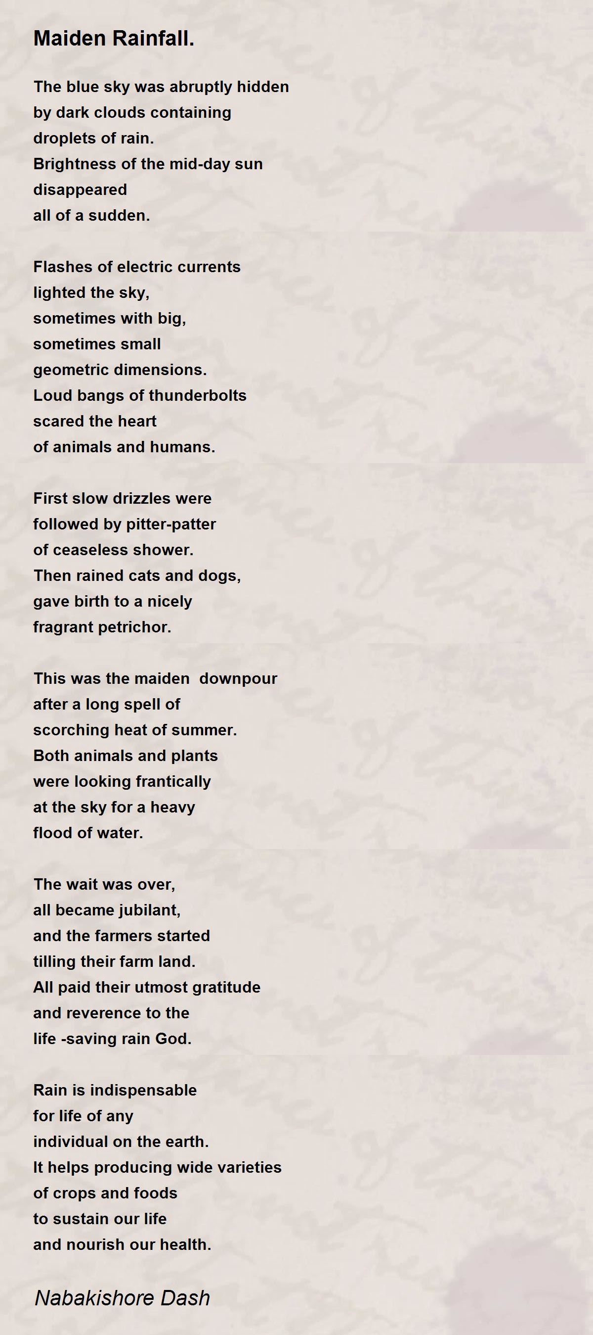 Maiden rainfall always brings joy to all especially plants. A beautiful poem that expresses in wonderful detail the importance of rain. Top Marks!