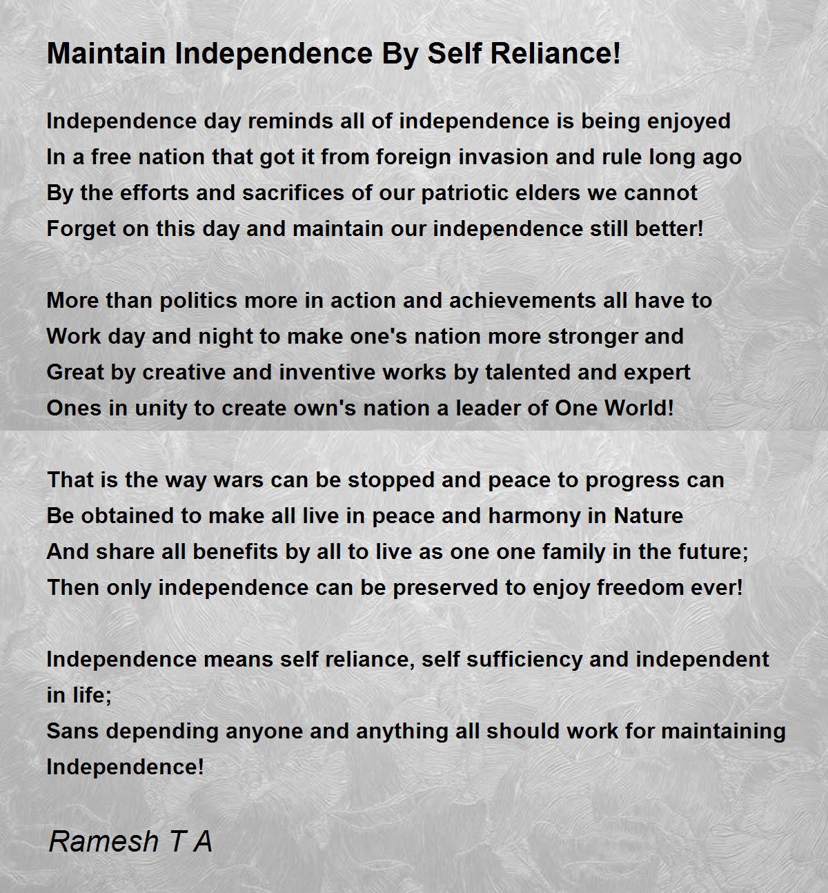 Independence means self reliance, self sufficiency and independent in life; Sans depending anyone and anything all should work for maintaining Independence!