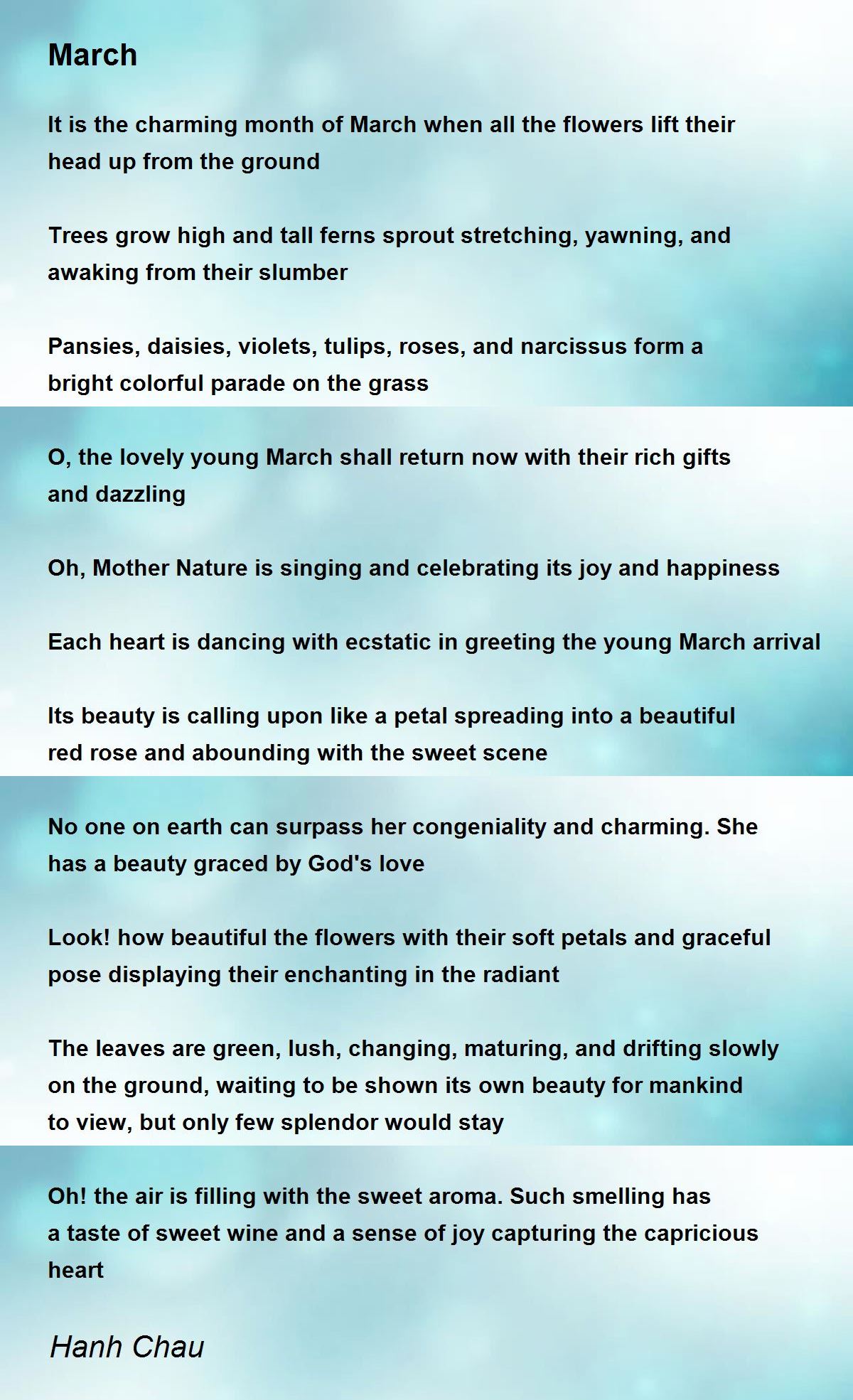 O, the lovely young March shall return now with their rich gifts and dazzling