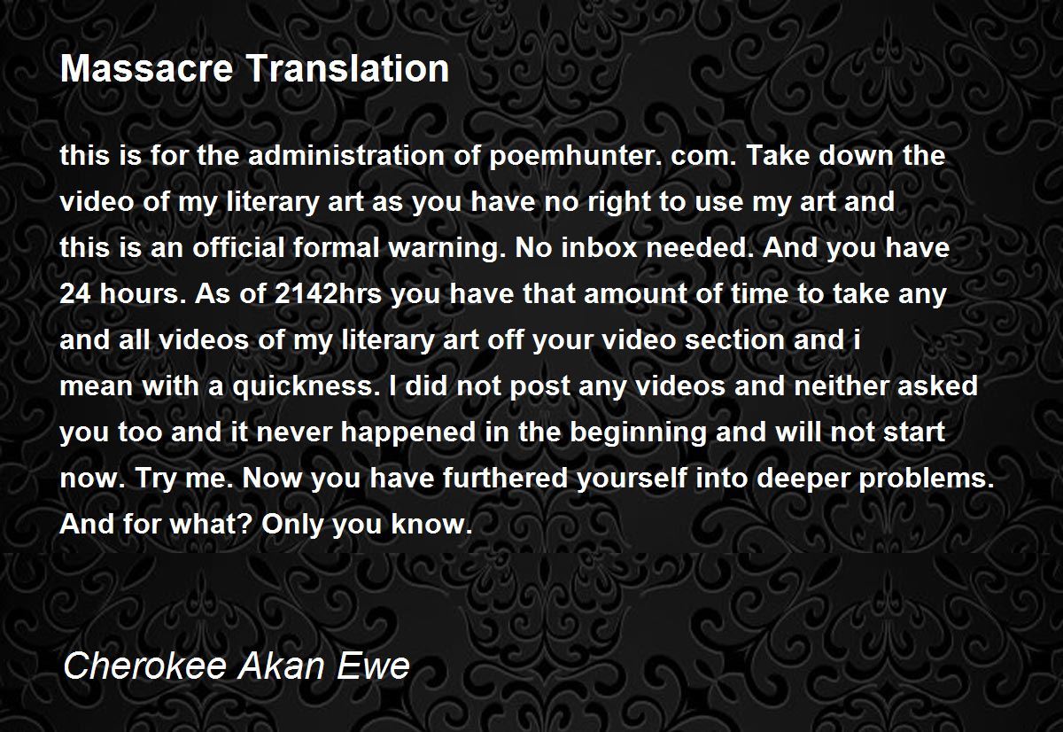 this is for the administration of poemhunter.com. Take down the video of my literary art as you have no right to use my art and this is an official formal warning. No inbox needed. And you have 24 hours. As of 2142hrs you have that amount of time to take any and all videos of my literary art off your video section and i mean with a quickness. I did not post any videos and neither asked you too and it never happened in the beginning and will not start now. Try me. Now you have furthered yourself into deeper problems. And for what? Only you know.