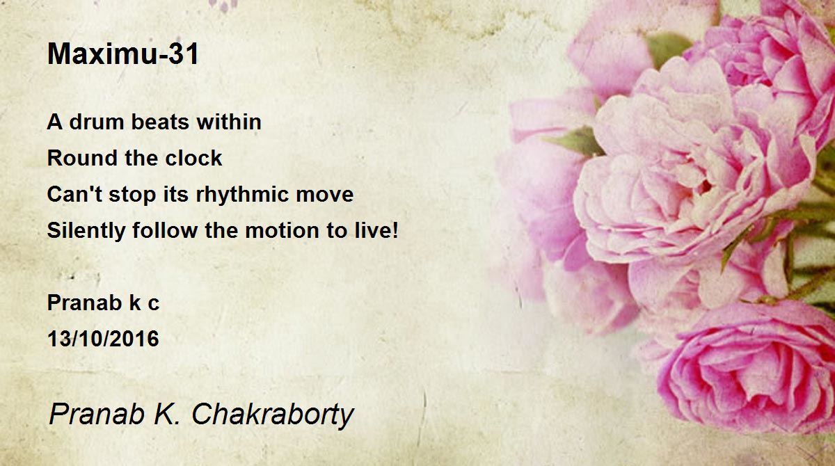 A drum beats within Round the clock Can't stop its rhythmic move Silently follow the motion to live! Pranab k c 13/10/2016