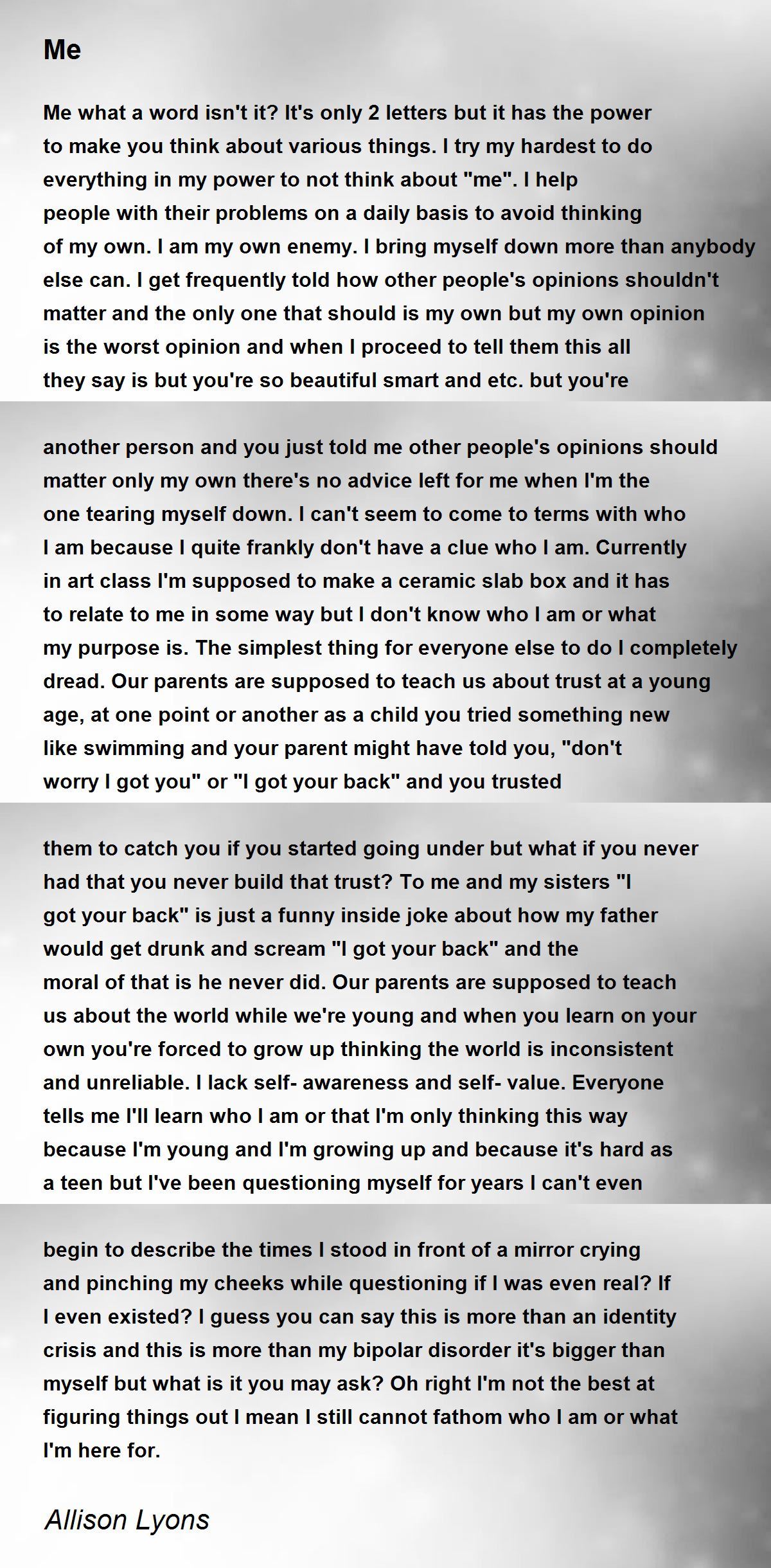 Me what a word isn't it? It's only 2 letters but it has the power to make you think about various things. I try my hardest to do everything in my power to not think about "me". I help people with their problems on a daily basis to avoid thinking of my own. I am my own enemy. I bring myself down more than anybody else can. I get frequently told how other people's opinions shouldn't matter and the only one that should is my own but my own opinion is the worst opinion and when I proceed to tell them this all they say is but you're so beautiful smart and etc. but you're another person and you just told me other people's opinions should matter only my own there's no advice left for me when I'm the one tearing myself down. I can't seem to come to terms with who I am because I quite frankly don't have a clue who I am. Currently in art class I'm supposed to make a ceramic slab box and it has to relate to me in some way but I don't know who I am or what my purpose is. The simplest thing for everyone else to do I completely dread. Our parents are supposed to teach us about trust at a young age, at one point or another as a child you tried something new like swimming and your parent might have told you, "don't worry I got you" or "I got your back" and you trusted them to catch you if you started going under but what if you never had that you never build that trust? To me and my sisters "I got your back" is just a funny inside joke about how my father would get drunk and scream "I got your back" and the moral of that is he never did. Our parents are supposed to teach us about the world while we're young and when you learn on your own you're forced to grow up thinking the world is inconsistent and unreliable. I lack self-awareness and self-value. Everyone tells me I'll learn who I am or that I'm only thinking this way because I'm young and I'm growing up and because it's hard as a teen but I've been questioning myself for years I can't even begin to describe the times I stood in front of a mirror crying and pinching my cheeks while questioning if I was even real? If I even existed? I guess you can say this is more than an identity crisis and this is more than my bipolar disorder it's bigger than myself but what is it you may ask? Oh right I'm not the best at figuring things out I mean I still cannot fathom who I am or what I'm here for.