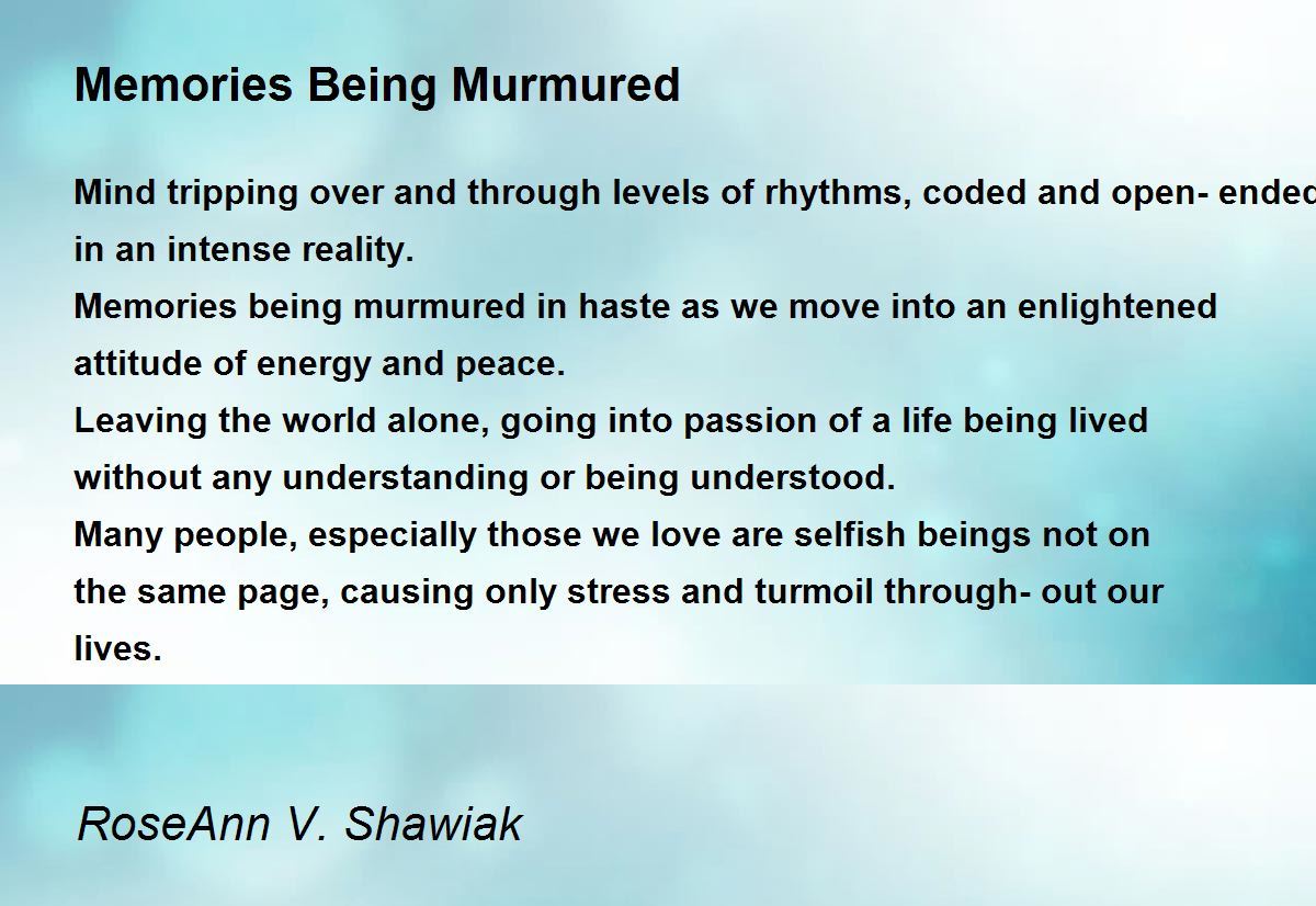Memories being murmured in haste as we move into an enlightened attitude of energy and peace.