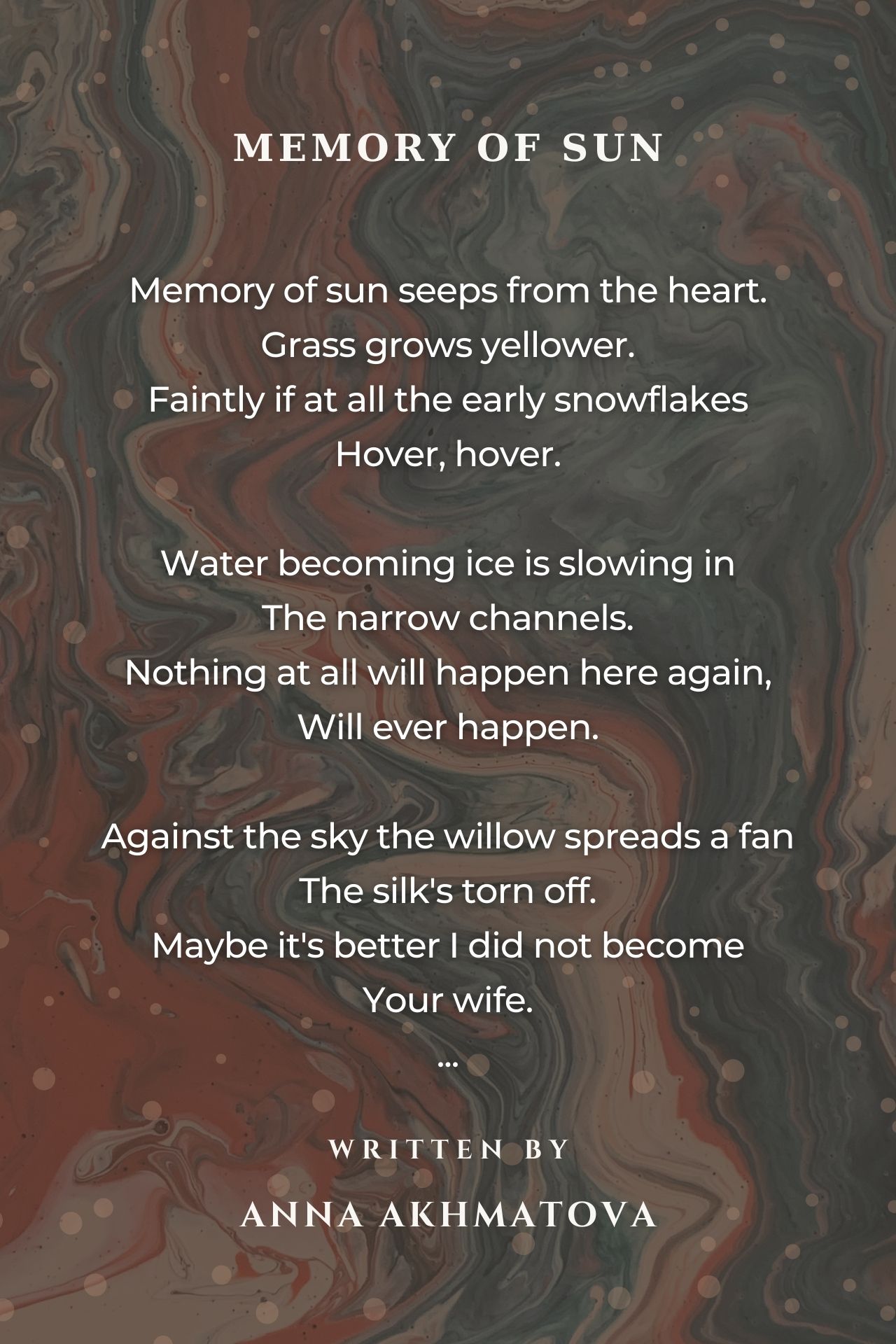 Against the sky the willow spreads a fan The silk's torn off. Maybe it's better I did not become Your wife. Memory of sun seeps from the heart. What is it? - Dark? Perhaps! Winter will have occupied us In the night. great write great 10++++++++++++++++++++++++++
