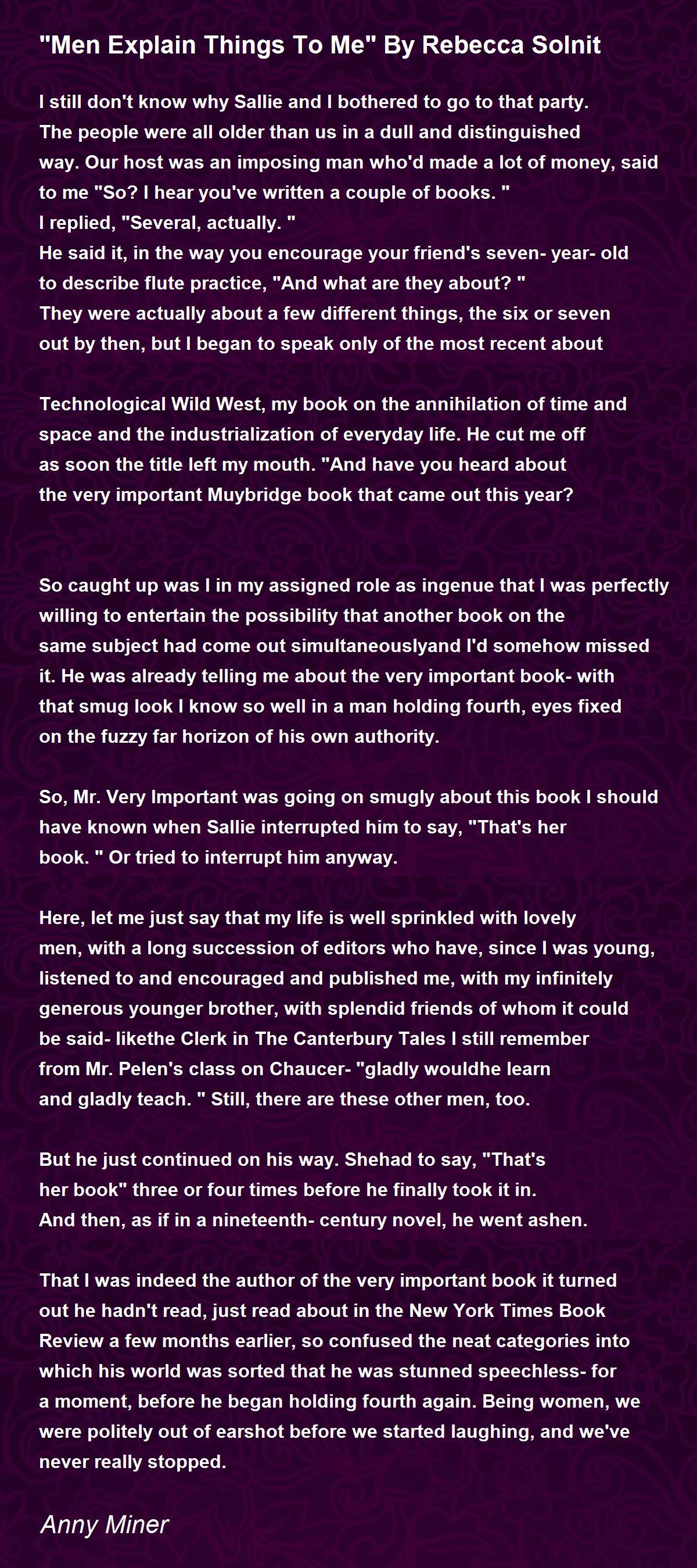 Here, let me just say that my life is well sprinkled with lovely men, with a long succession of editors who have, since I was young, listened to and encouraged and published me, with my infinitely generous younger brother, with splendid friends of whom it could be said- likethe Clerk in The Canterbury Tales I still remember from Mr. Pelen's class on Chaucer- "gladly wouldhe learn and gladly teach." Still, there are these other men, too.